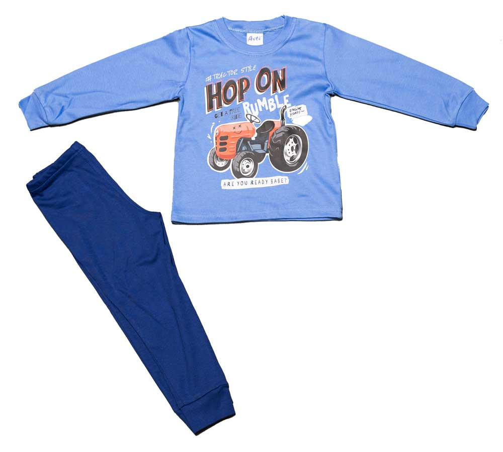 Gyermeked esti rutinját különlegessé teheted ezzel a 2 részes fiú pizsamával, amely traktoros mintával készült! A kék színű, hosszú ujjú felsőrész vidám traktoros mintával lett díszítve, amely minden kis traktor rajongót le fog nyűgözni. A gumis derekú nadrág pedig garantálja az egész éjszakai kényelmet és szabad mozgást. Ez a pizsama nem csak stílusos, hanem kiváló minőségű is. 100% pamutból készült, amely puha, légáteresztő és bőrbarát anyag, így gyermeked bőre egész éjjel szellőzni fog. Minőségi magyar termék, amelyet a megbízható Andrea Kft. gyártott. Válaszd ezt a pizsamát, hogy gyermeked éjszakája is vidám és kényelmes legyen!