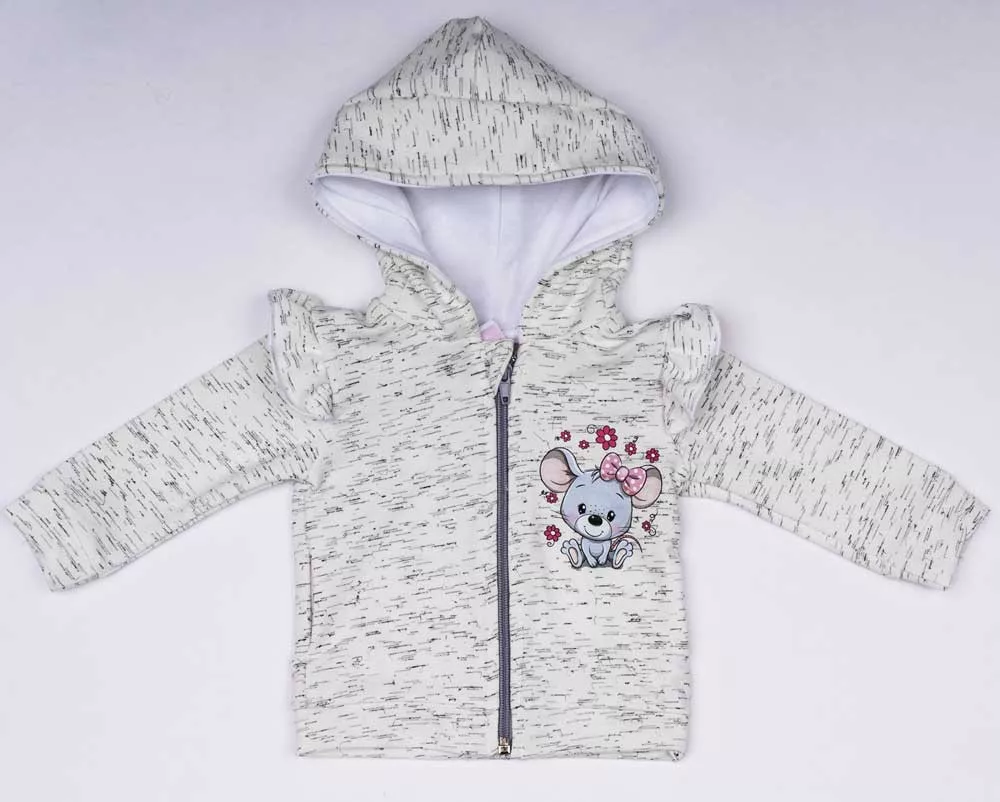 Kétrészes kislány szabadidő szett Egérke mintával Kényeztesse kislányát ezzel a két darabos, Egérke mintás szettel. A szett nyers színű, éppen olyan cuki, mint a rajta lévő karakter. A szett egy kapucnis cipzáras felsőből és egy elegáns nadrágból áll, amelyek finom részletekkel, minőségi kidolgozással és visszafogott nyomással készültek. A fodrok, a vékonyított passzé kidolgozás eleganciát kölcsönöznek az összeállításnak. Az anyaga vékony minőségi pamut poliészter, amely szín- és formatartó, valamint jól bírja a mosást. A szett csinos, mégis sportos, jól variálható, és garantáltan a kislányok kedvence lesz. Minőségi magyar termék Anyaga: 65% pamut, 35% poliészter Minőség: I. osztály