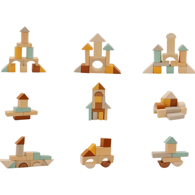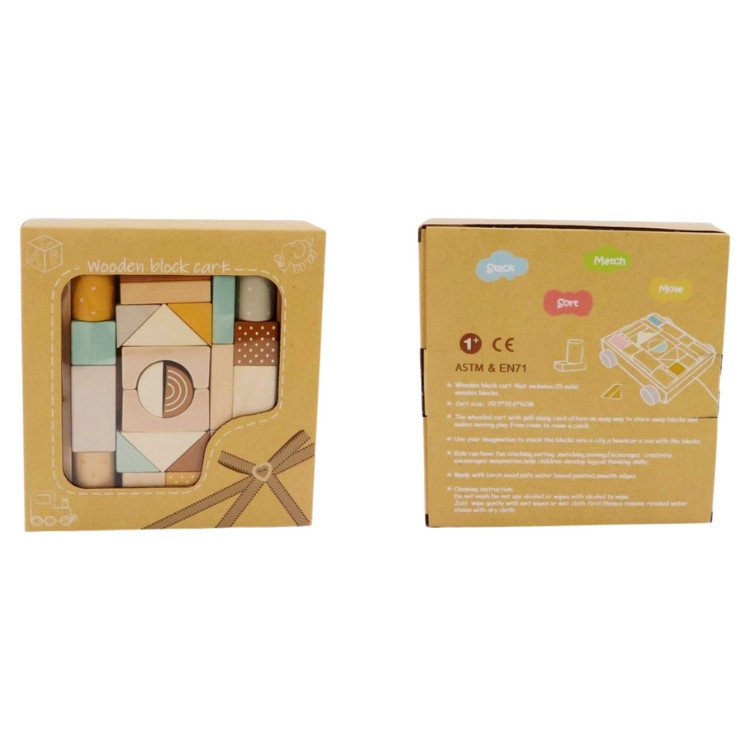 Húzogatós kiskocsi színes építőkockákkal. A kocsi a kockák tárolására is alkalmas, mely ösztönzi a gyermeket a rend szeretetére. Az építőkockák játékosan segítenek a színek, formák elsajátításában. Fejleszti a finommotorikus mozgást és a koncentrációt, emellett remek szórakozás a kicsiknek.