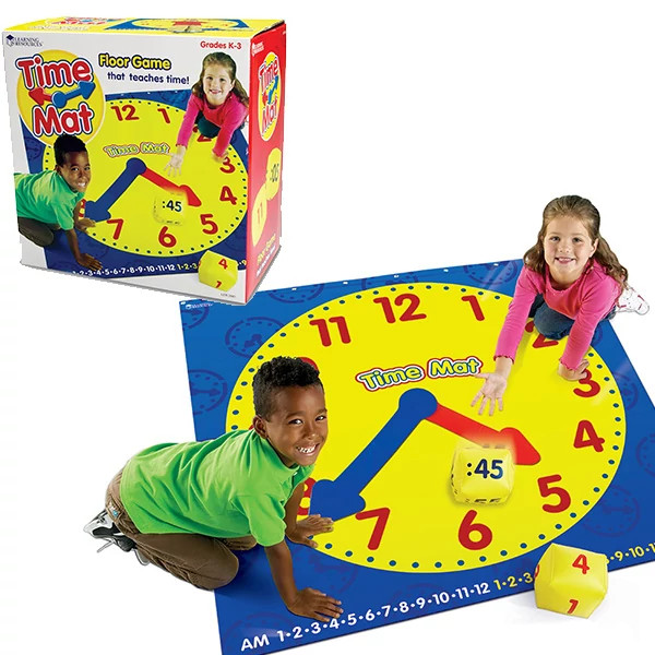 A játék menete egyszerű és élvezetes: a gyerekek dobnak a készlethez tartozó 4 felfújható kockával (piros kockák az órákat, kék kockák a perceket jelölik), majd a kidobott értékek alapján beállítják az időt az órán. A nagyméretű játszószőnyeg emellett számos további játéklehetőséget kínál az idő fogalmának elmélyítésére.