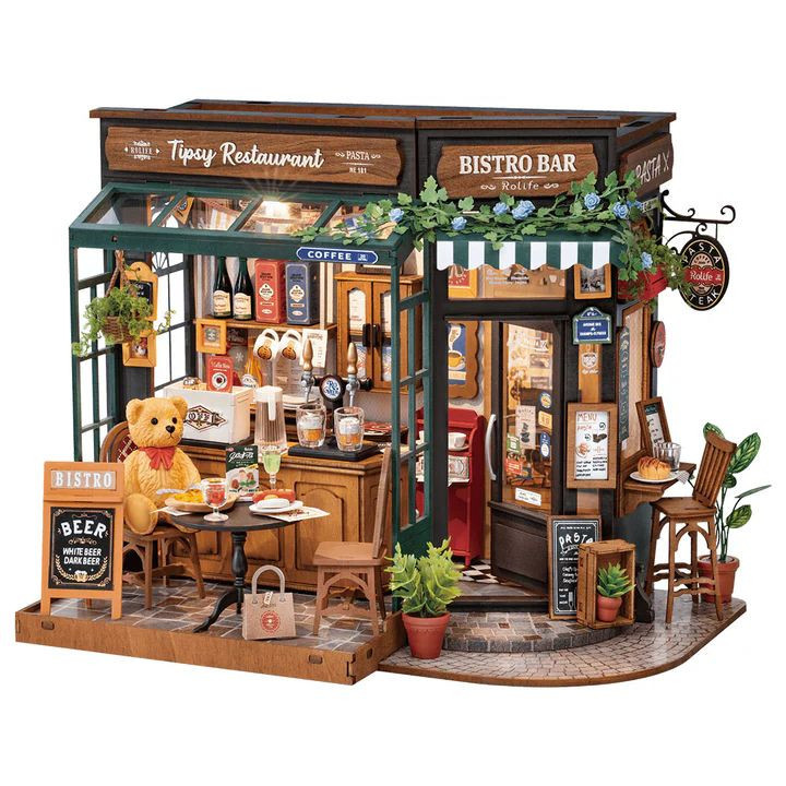 A Rolife márka híres finoman kidolgozott DIY (Do It Yourself) modelljeiről, és a Tipsy Restaurant is ezt a hagyományt folytatja. A gyönyörűen megtervezett homlokzat, a hangulatos belső tér, a pici asztalok és a LED-es világítás mind azt a meleg, hívogató légkört idézik, amelyet egy igazi kisvárosi étterem áraszt magából.