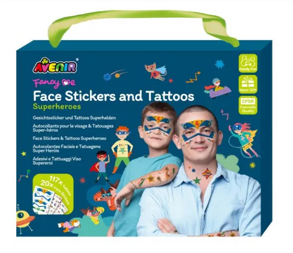 Szereted a szuperhősöket? Akkor ezt a készletet neked találták ki! Az arcmatricák és tetoválások gondoskodnak arról, hogy kedvenc motívumaid megelevenedjenek a bőrödön! A készletben ráadásul nagyobb méretű arcmatricák is találhatók, így akár bevonhatod anyát vagy apát, esetleg a testvéredet is a játékba.