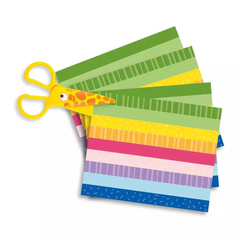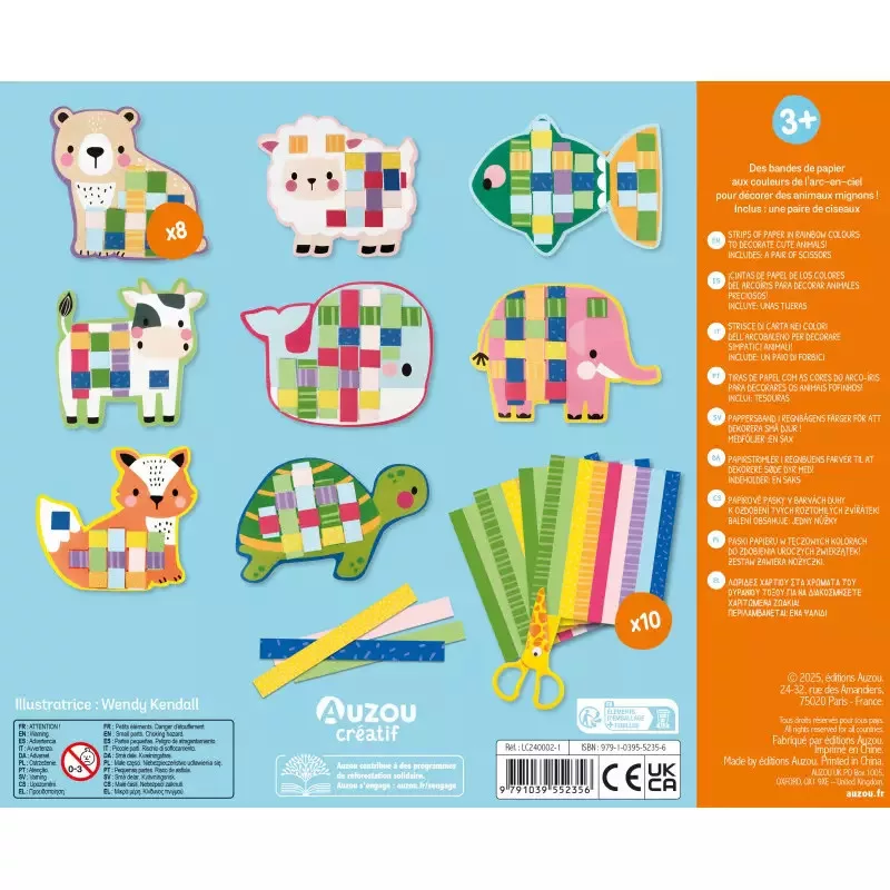 A készlet tartalmaz egy műanyag ollót, amely a kicsik számára is biztonságos, és amivel felvághatják a 10 db mintás lapot, így gyakorolva az ollóhasználatot, valamint 8 papírfigurát. A papírcsíkok fűzögetésével a gyerekek izgalmas mintákat adhatak az állatfiguráknak, így fejlesztve kézügyességüket, koncentrációjukat és kreativitásukat.