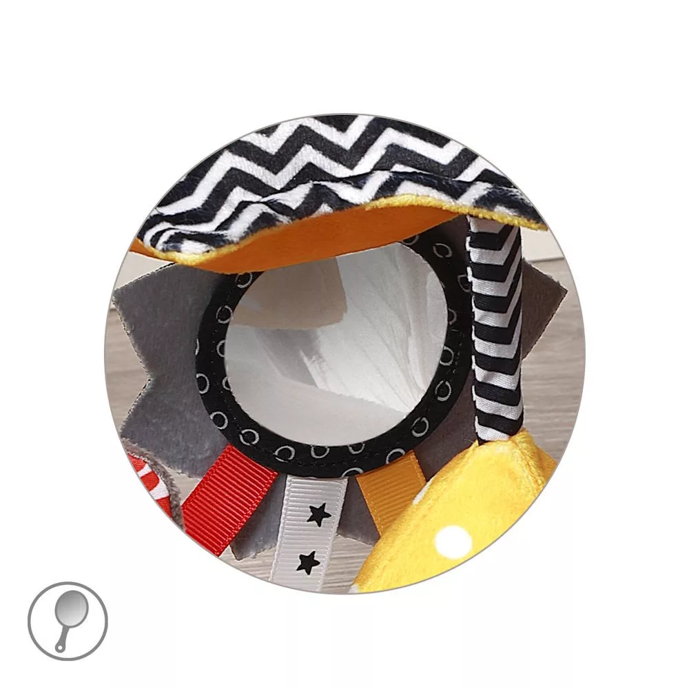 Két csörgõvel és susogó elemmel szereltük fel, amelyek serkentik a hallást, színes címkékkel és egy göndör farokkal, amelyek ösztönzik a fogást, valamint egy biztonságos tükörrel, hogy felfedezhessék a saját tükörképüket. Kontrasztos színekben és geometrikus mintákkal alkottuk meg, hogy az élet elsõ hónapjaitól kezdve fejlessze a látást.