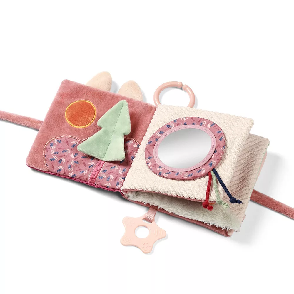 Stimuláló könyvünk lapjai tartalmaznak egy susogó elemet, amely gyûréskor érdekes hangokat ad ki, egy csörgõt, amely rázásra ösztönzi, egy tükröt, amely lehetõvé teszi gyermeke számára, hogy felfedezze saját tükörképét, címkéket és zsinórokat, amelyek ösztönzik a fogást, valamint egy rágókát, amely masszírozza az ínyét.
