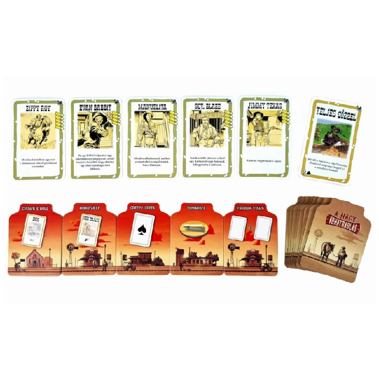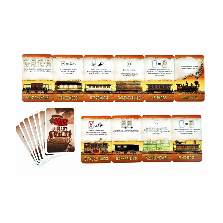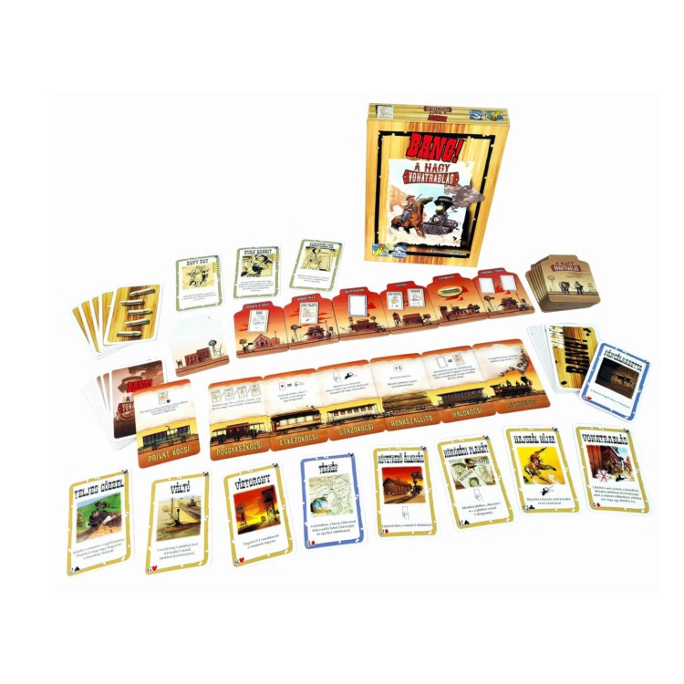 A Bang! A nagy vonatrablás a népszerű, titkos szerepes partijáték kiegészítője, ami új karaktereket és mechanizmust hoz a játékba: vonatot rabolhatunk, hogy az ott szerzett zsákmányokat felhasználhassuk egymás ellen...