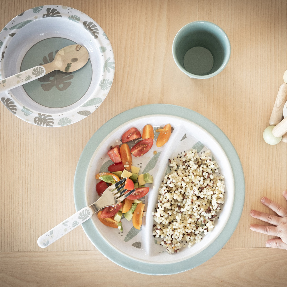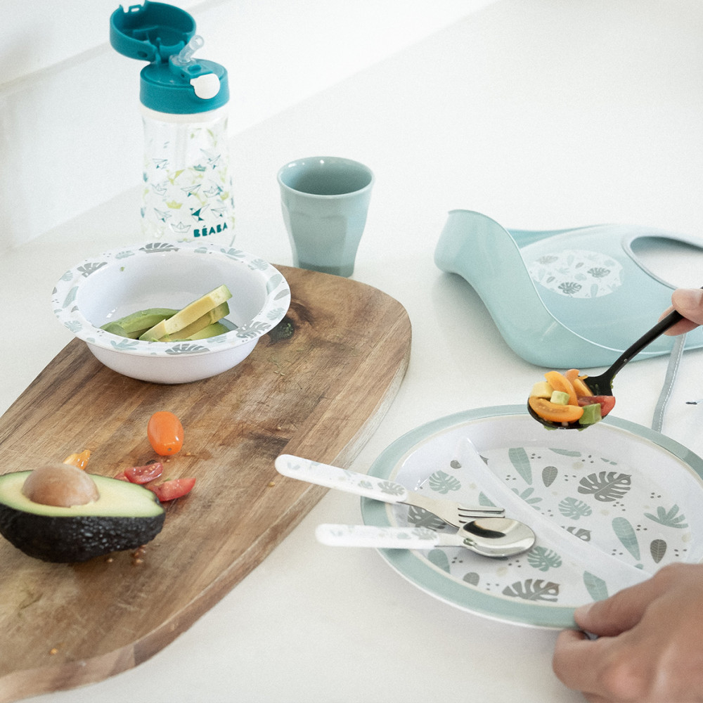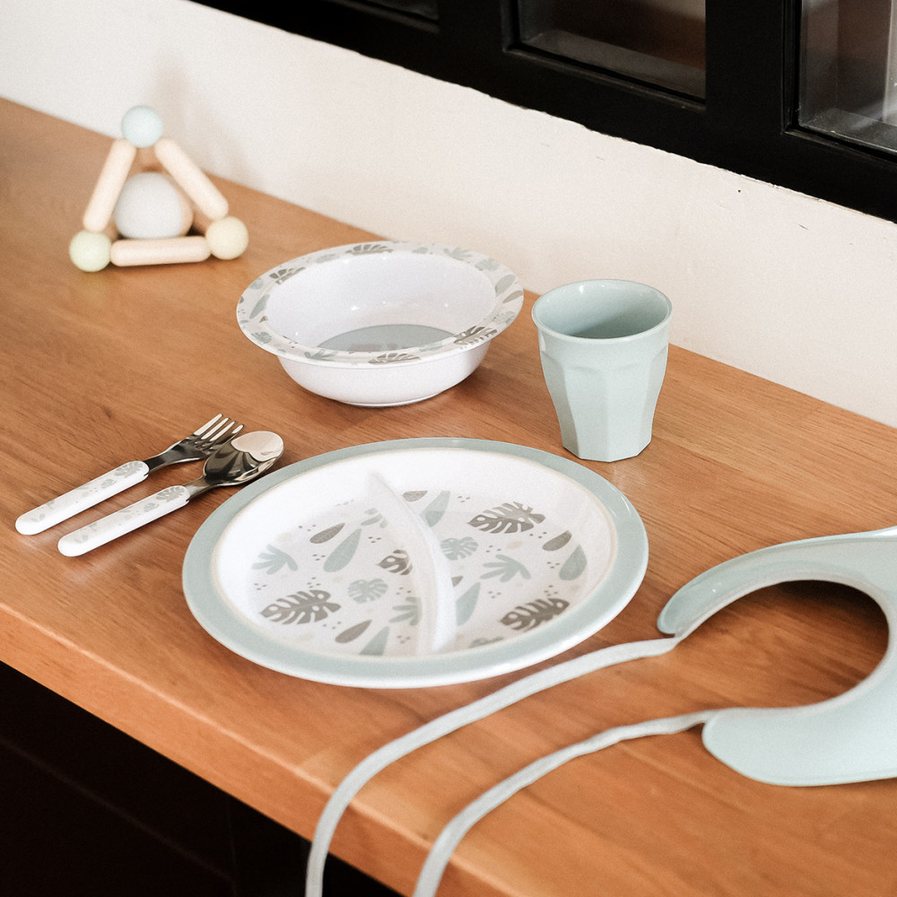 Étkészlet, amely egy tányérból, egy mélytányérból, egy csészéből és rozsdamentes acél evőeszközökből áll.