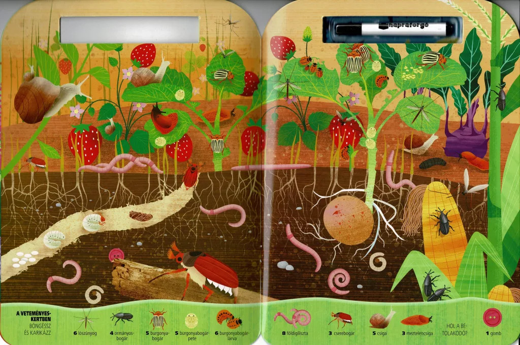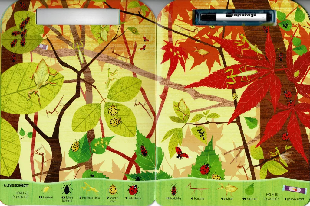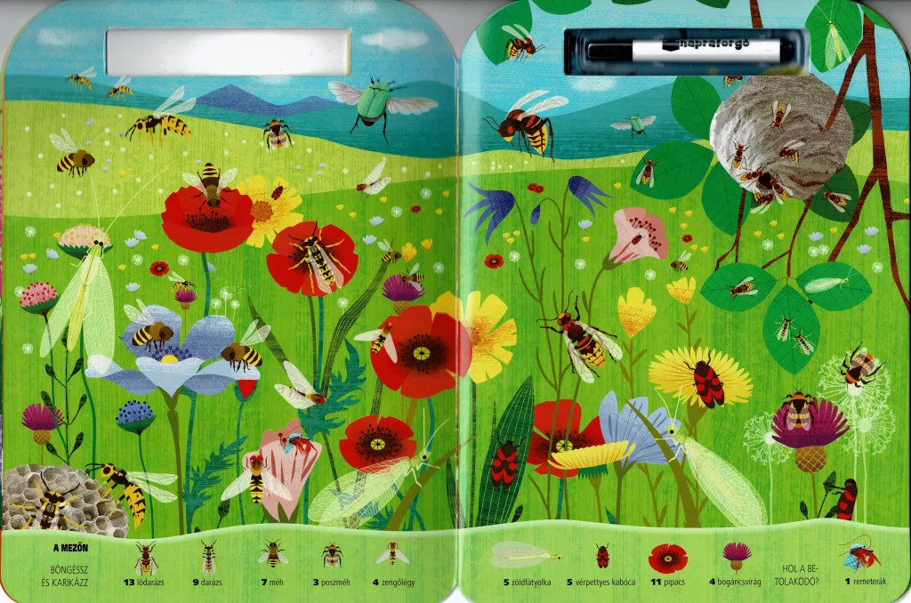 A füzet oldalain élénk, részletgazdag illusztrációk és keresőfeladatok várják a gyerekeket: a cél, hogy megtalálják és bekarikázzák a képeken elrejtett bogarakat, rovarokat és egyéb apró élőlényeket. A letörölhető toll lehetővé teszi a feladatok újrajátszását, így a gyerekek bátran próbálkozhatnak, javíthatnak, és minden alkalommal új élményt élhetnek át.
