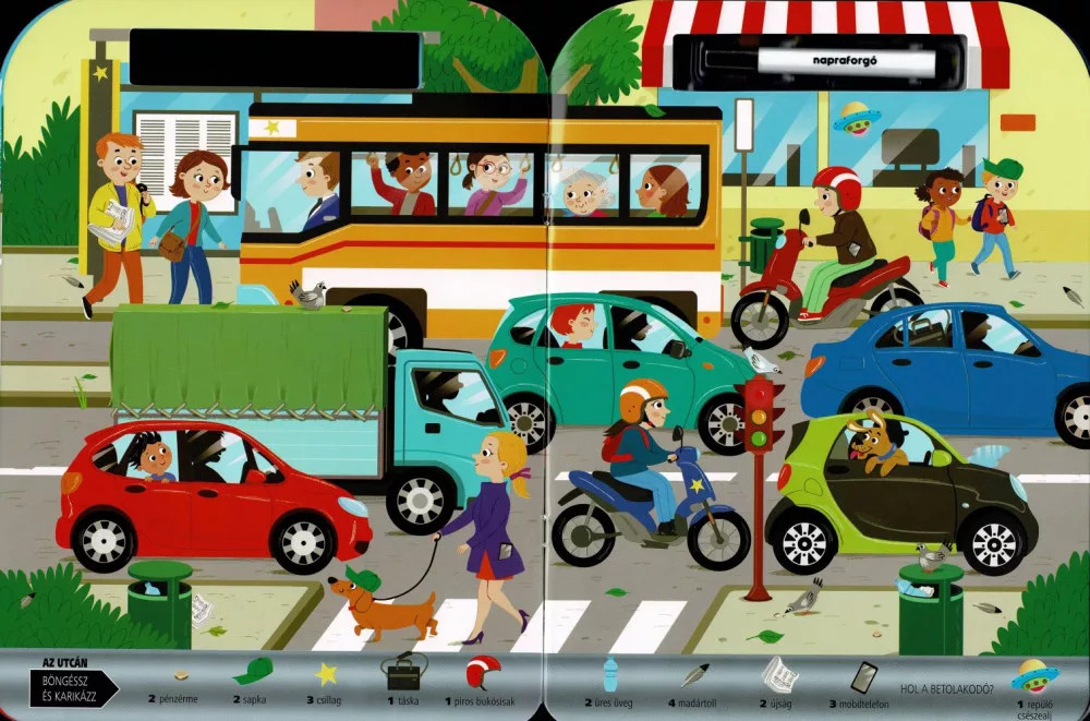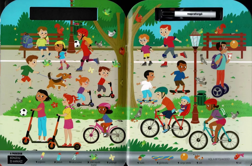 A füzet minden oldalán részletgazdag képek várják a gyerekeket, akiknek az a feladatuk, hogy megtalálják és bekarikázzák az elrejtett elemeket. A játék során fejlődik a vizuális figyelem, a kéz–szem koordináció és a részletek észrevételének képessége. A letörölhető tollal többször is újrajátszhatóak a feladatok, így a kísérletezés és újrapróbálkozás természetes része lesz a tanulásnak.