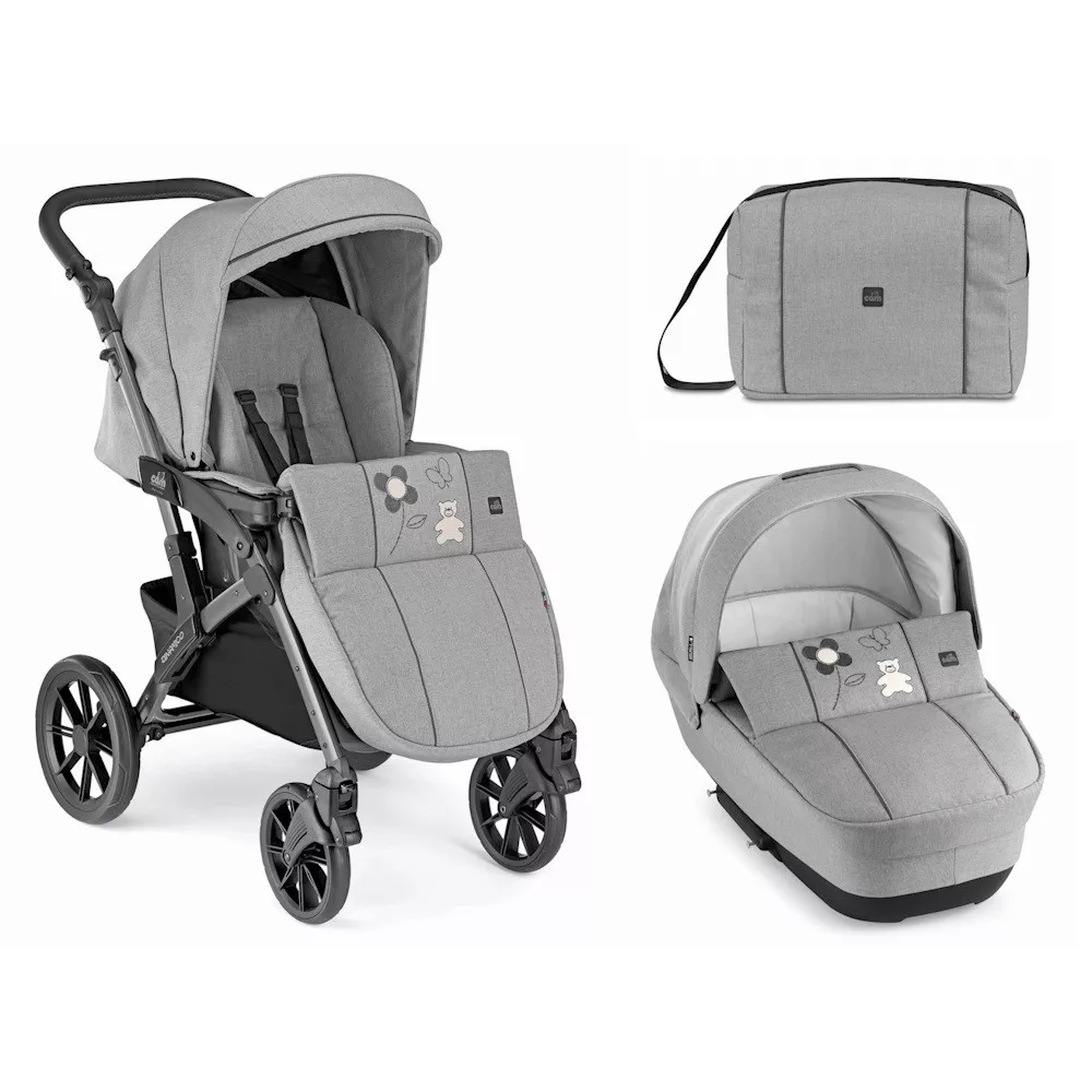Tartalma: babakocsi váz üléssel (naptetõvel), mózeskosárral (kupolával és lábtakaróval), és pelenkázótáska