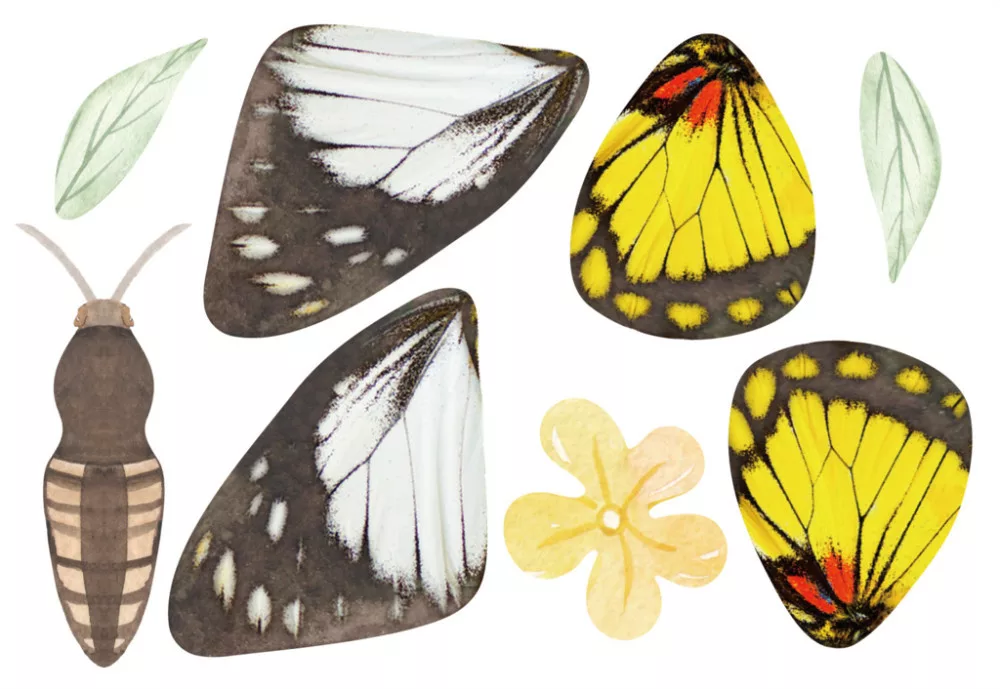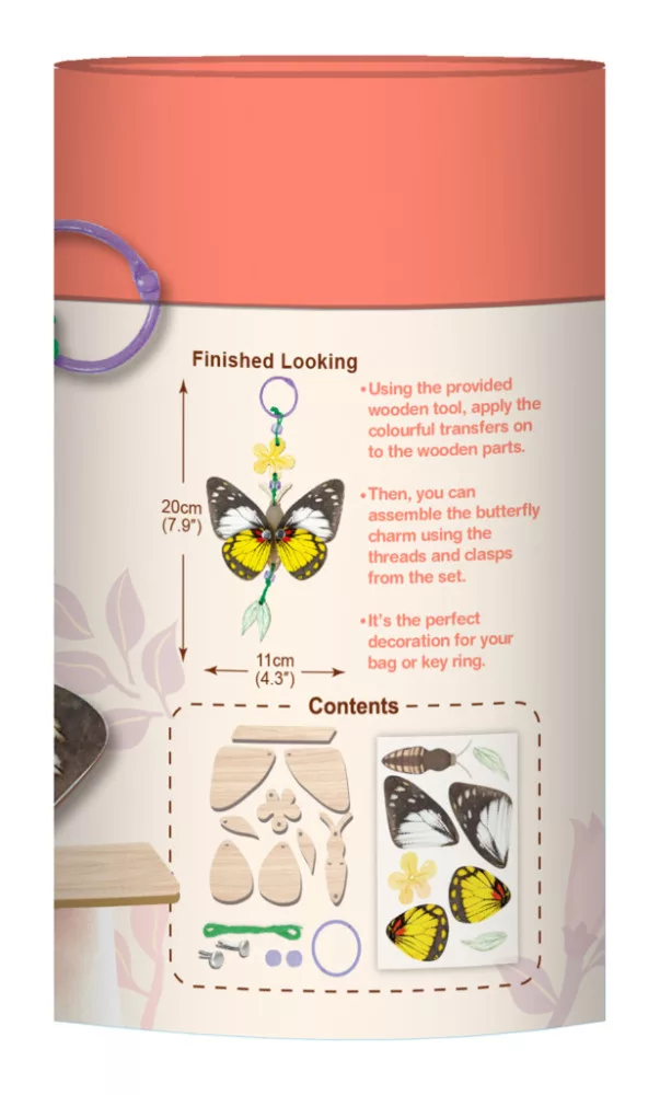 A mellékelt fa eszközzel vidd fel a színes matricákat a megfelelő elemekre, majd szereld össze a pillangó charm-ot a készletben található fonalak és kapcsok segítségével.