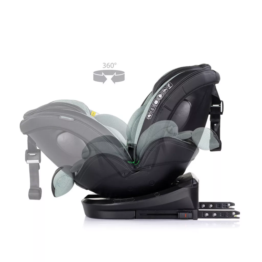 360 fokban forgatható autósülés, 40-150 cm-ig. Kiválóan párnázott autósülés, így már a legkisebbek is kényelmesen utazhatnak.