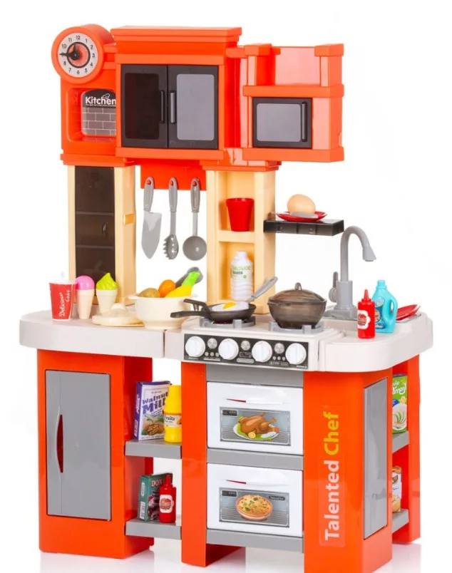 • Tartalmaz 79 különálló játékot és kiegészítőt - edényeket, csaptelepet, kiegészítő játék élelmiszereket és magát a konyhát.