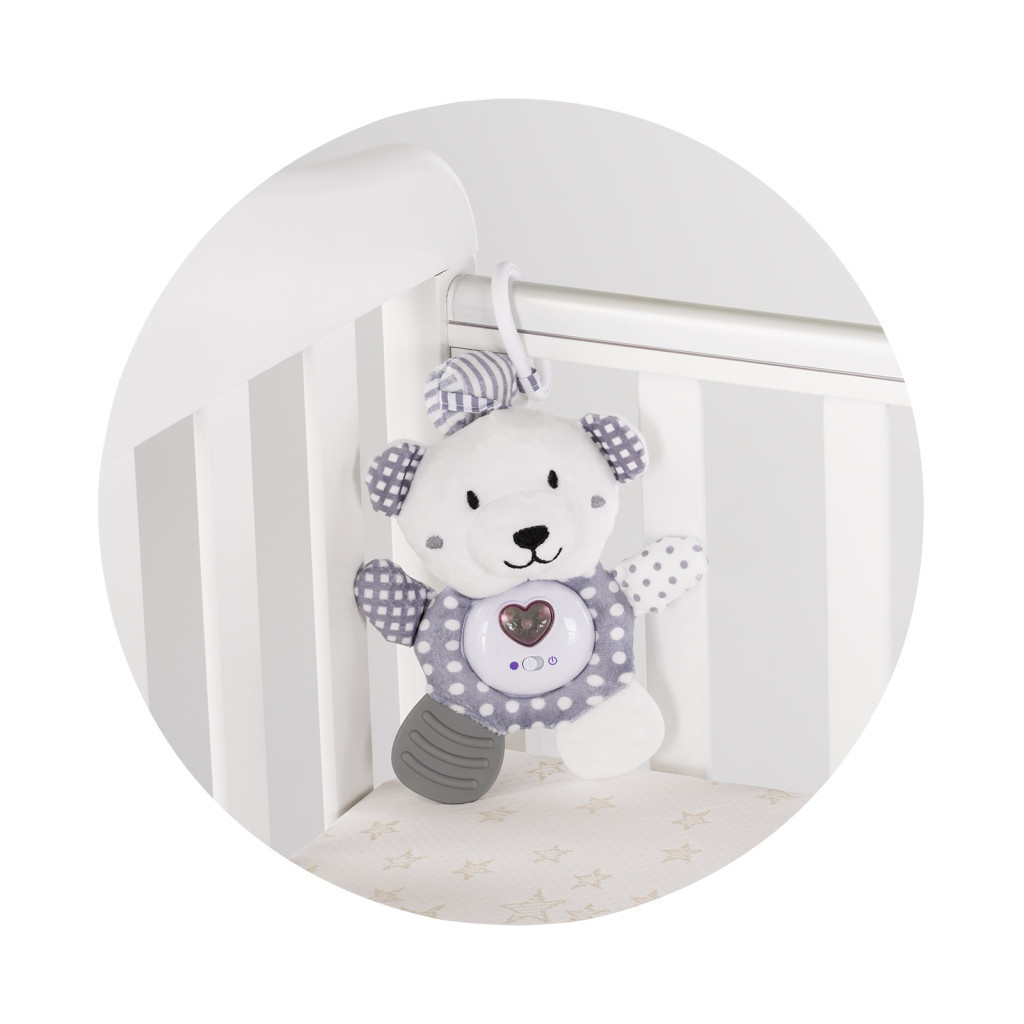 Kompakt kialakításának köszönhetően a babakocsira vagy kiságyra egyszerűen rögzíthető. Ezek az ölelnivaló barátok tökéletes társak a kicsik számára.