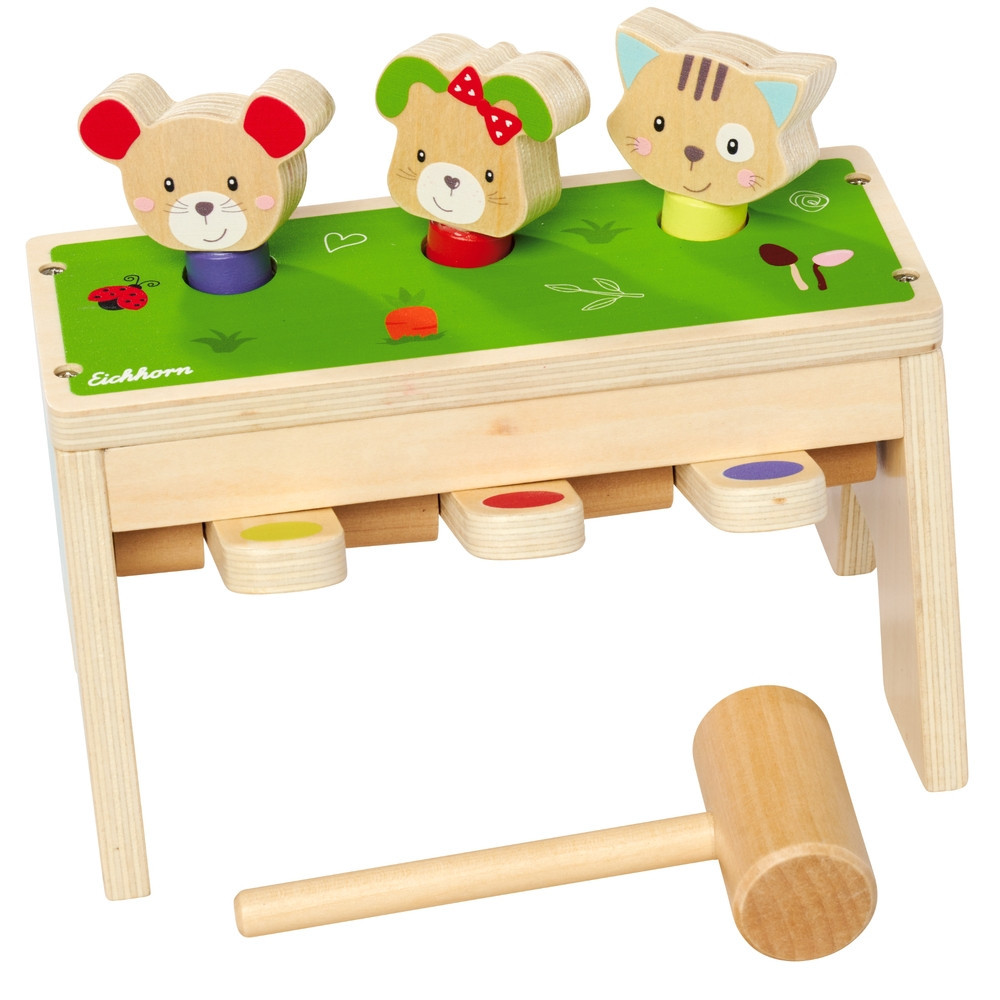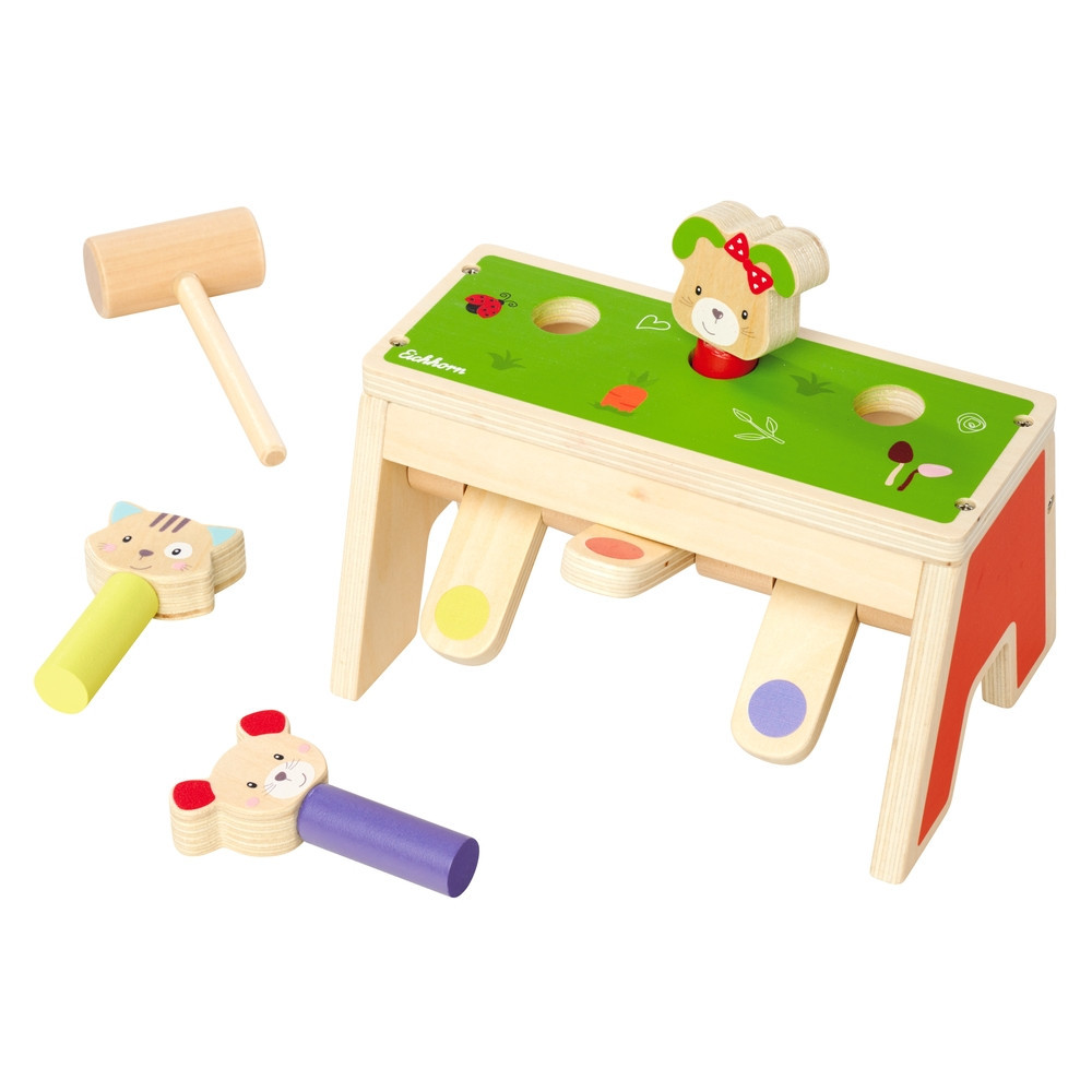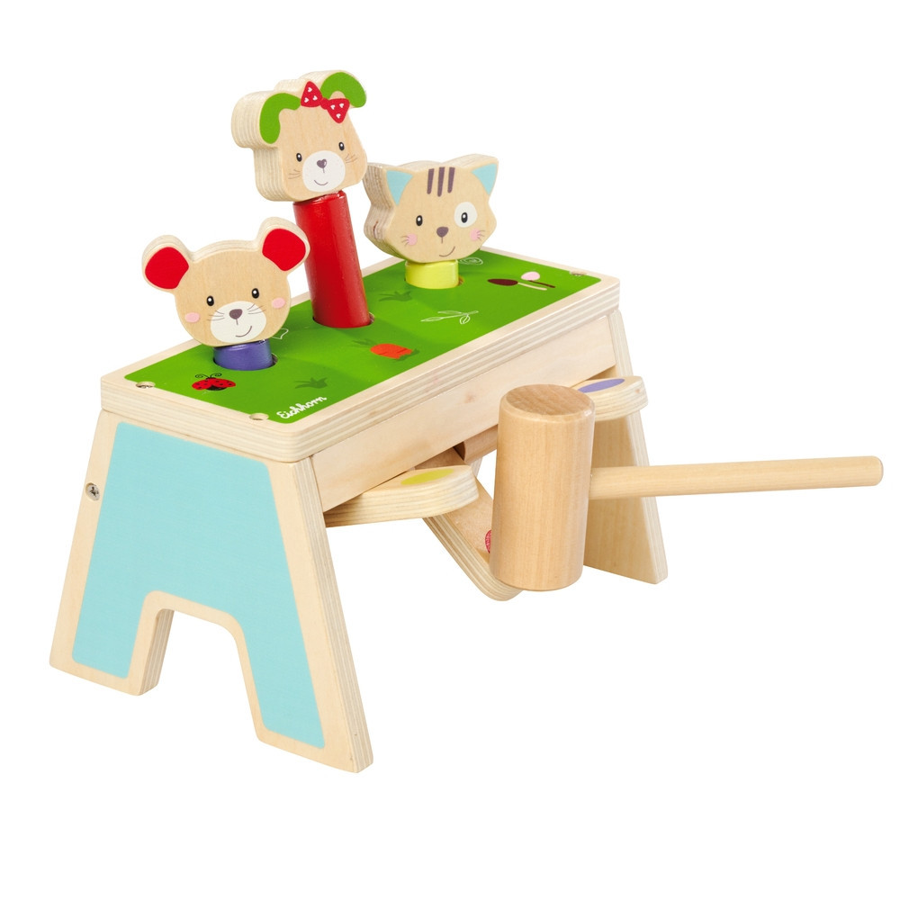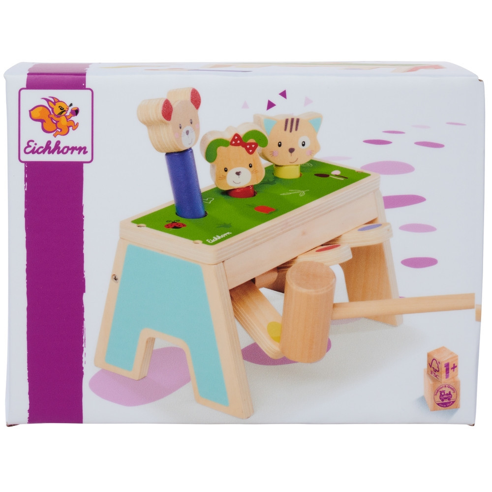 Az Eichhorn Friends fa kalapálós játék már 1 éves kortól vidám, mégis céltudatos elfoglaltságot ad: a gyermek a fa kalapáccsal leüti a színes, állatos figurákat, amelyek újra előbukkannak – így a játék folyamatos meglepetést és sikerélményt kínál.