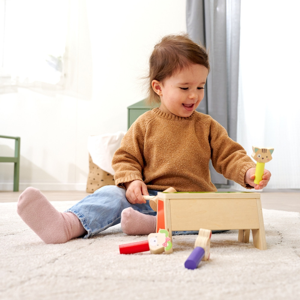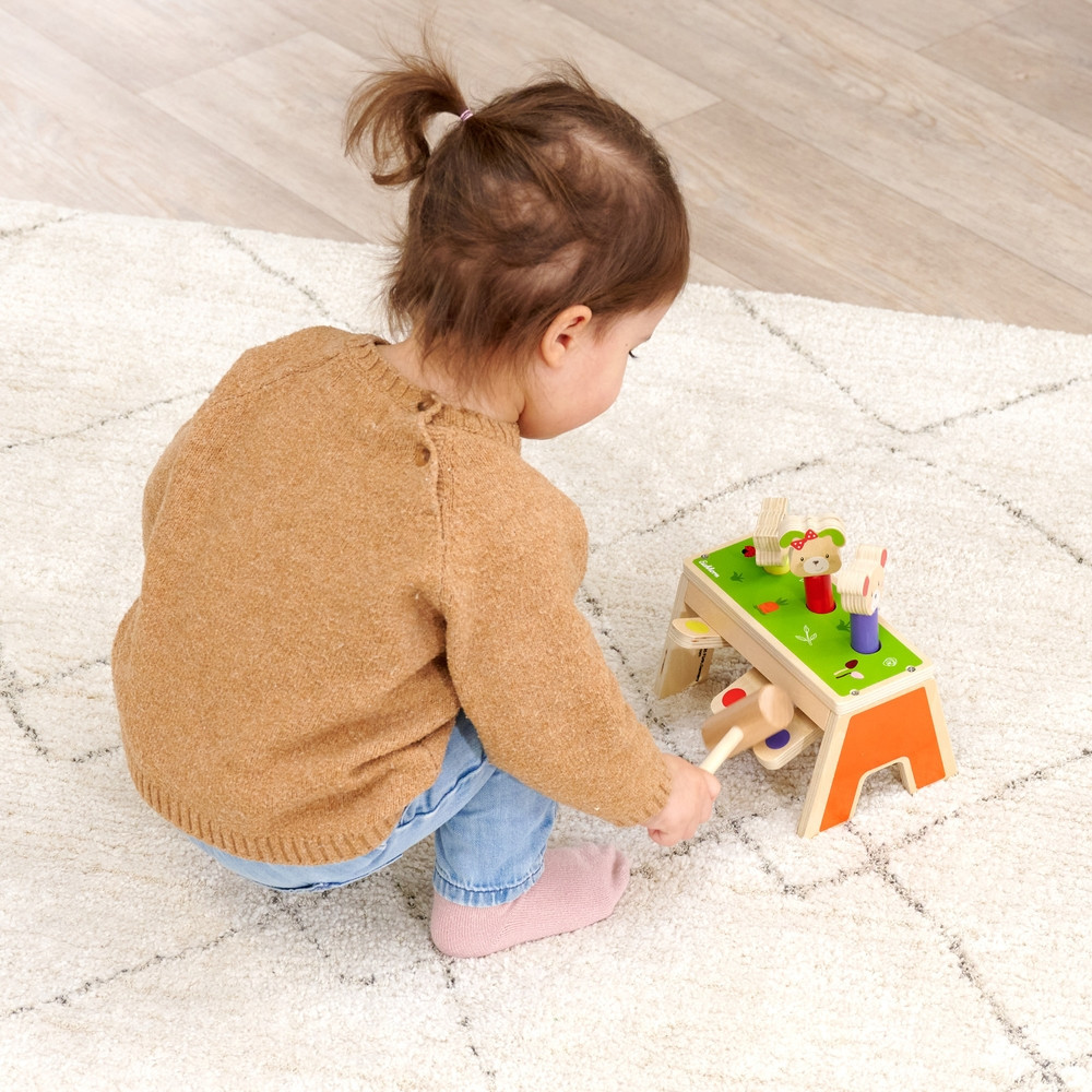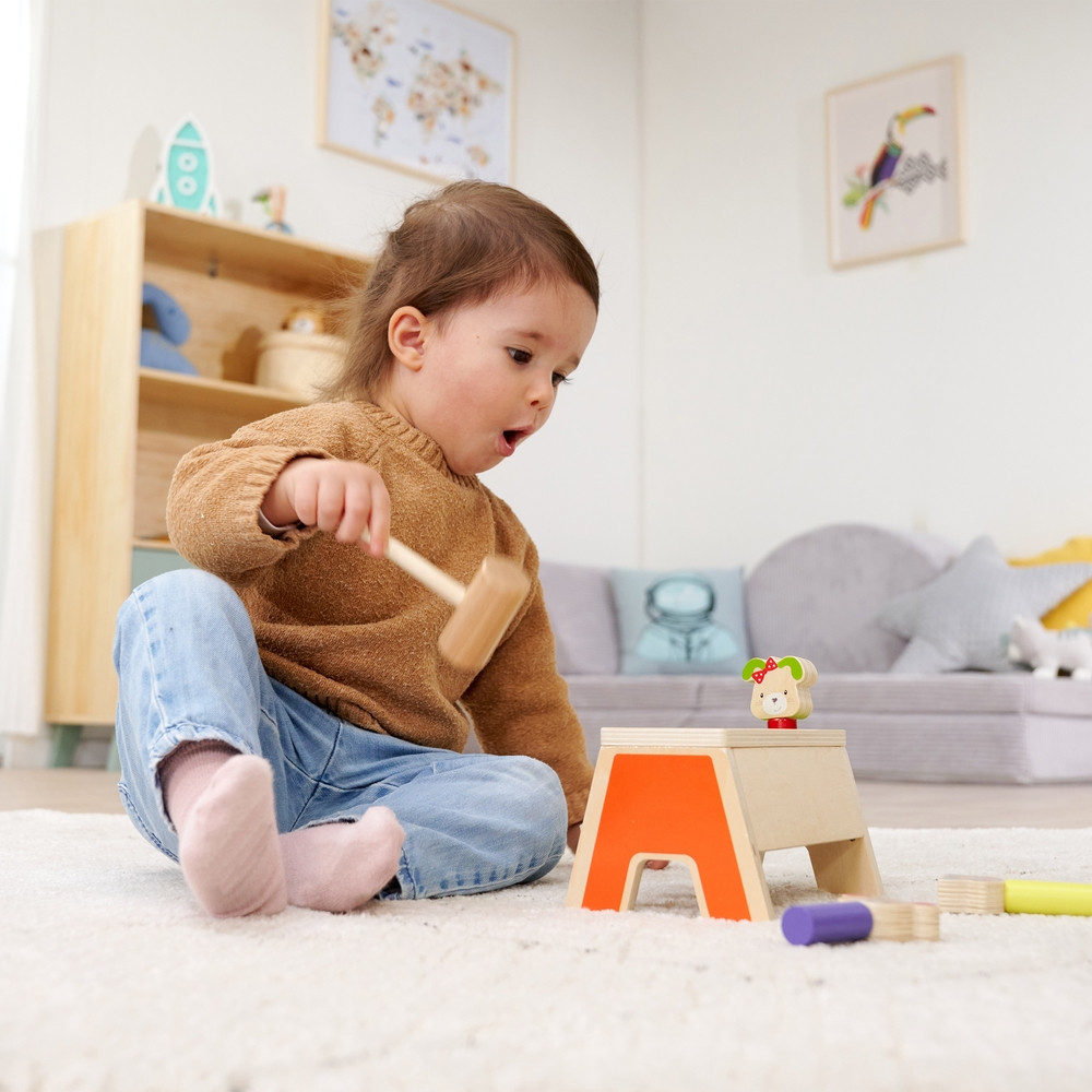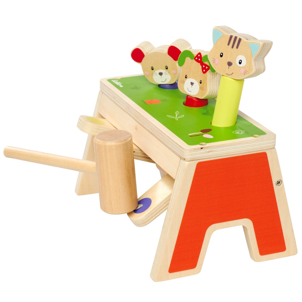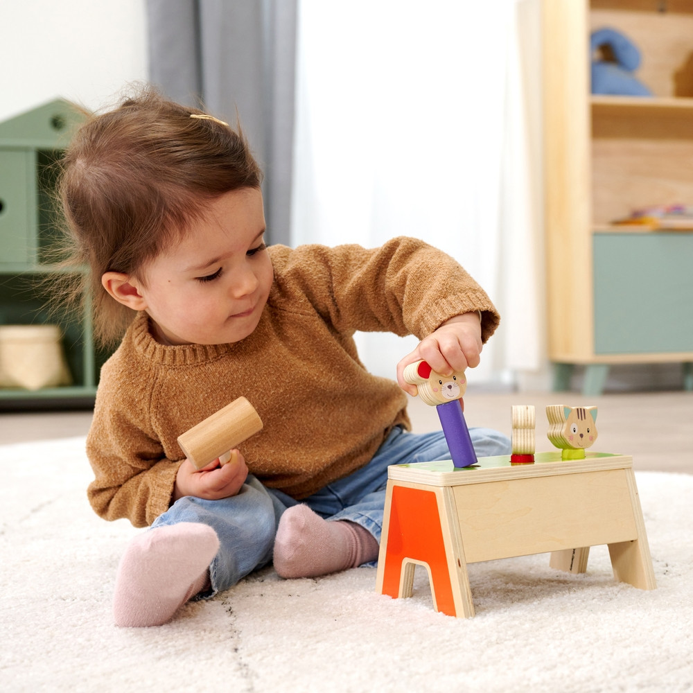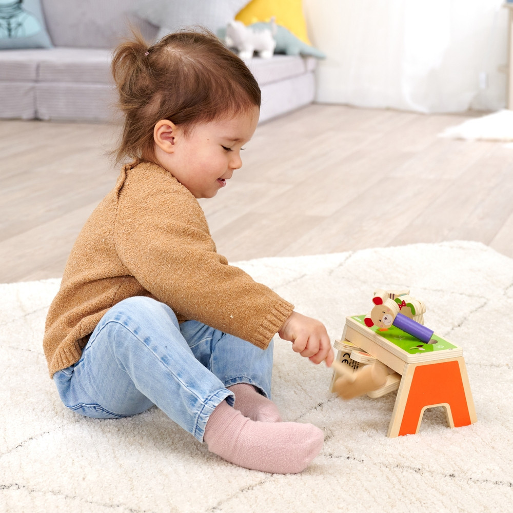 A természetes fa anyag, a lekerekített elemek és a strapabíró kivitel biztonságos használatot, a célzás és ütögetés pedig a finommotorika és a szem–kéz koordináció fejlődését támogatja. Színes figuráival a kicsik a színeket is könnyen megismerik.