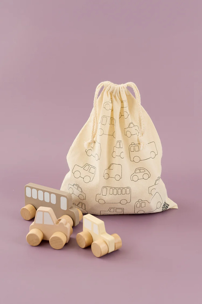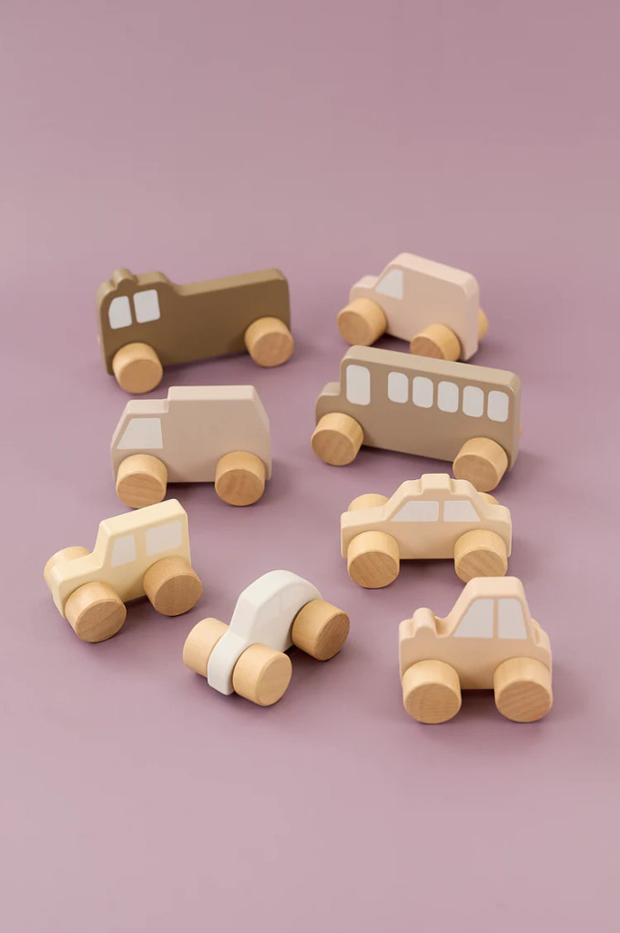 Aranyos kisautók a legkisebbeknek. Az autók masszív kerekekkel rendelkeznek, így könnyedén mozoghatók. A játékhoz 8 különböző jármű tartozik, amelyek egy szövetzsákba vannak csomagolva, így utazáskor is mindig magaddal viheted azokat.