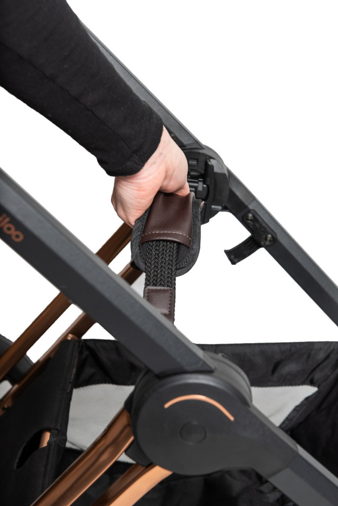 • Teleszkópos tolókar: Állítható magasság, hogy minden szülő számára kényelmes legyen a babakocsi irányítása.