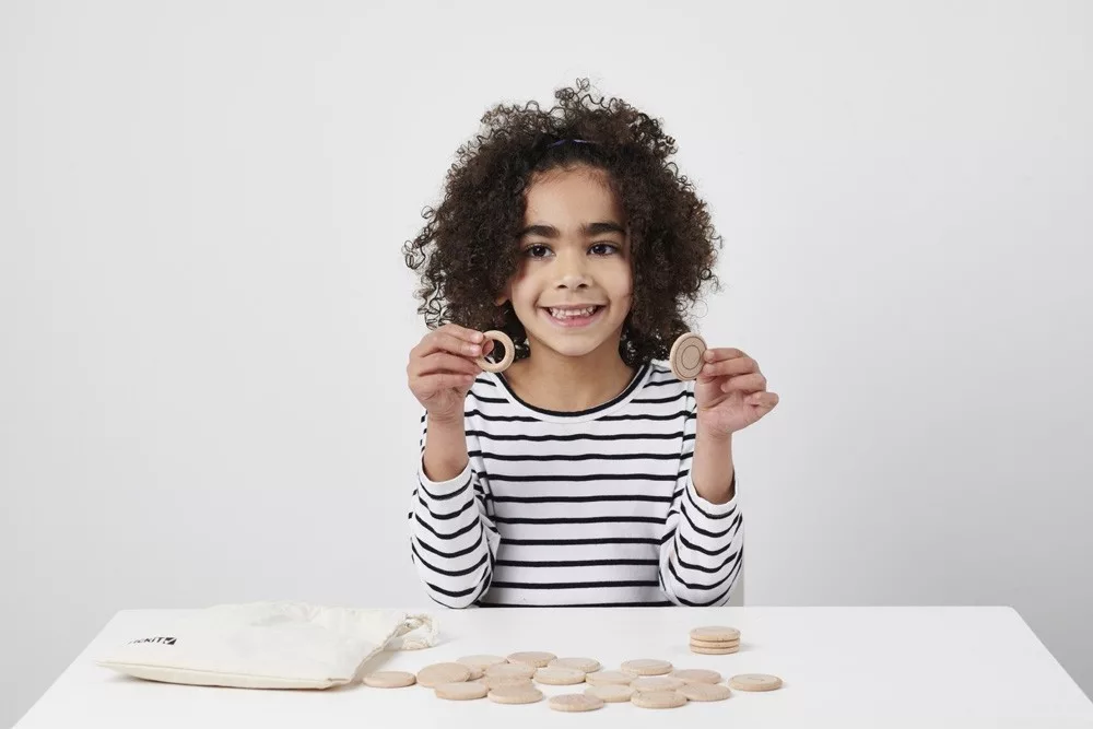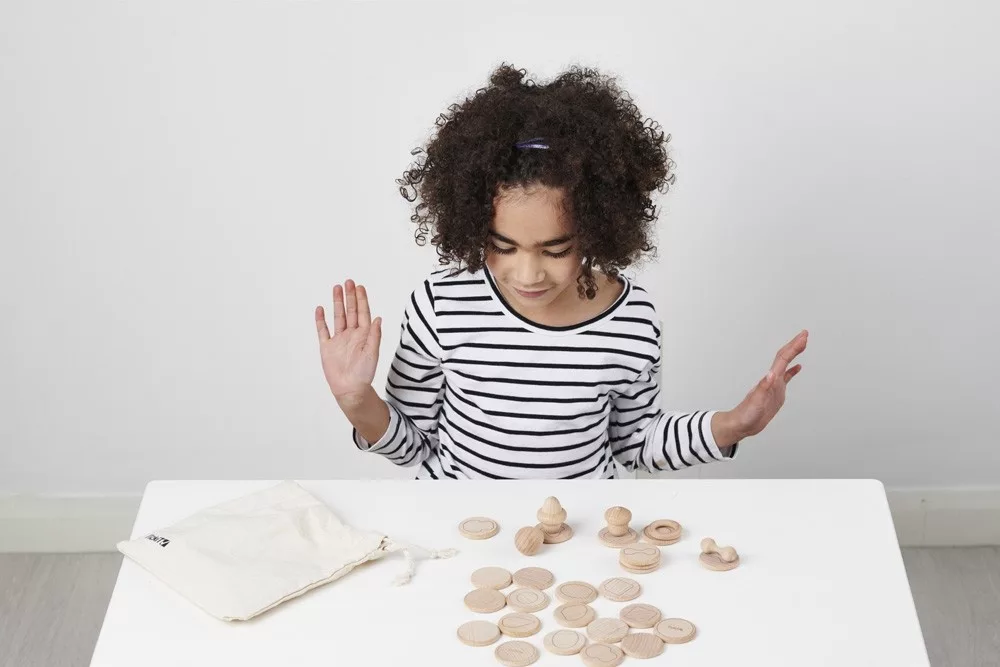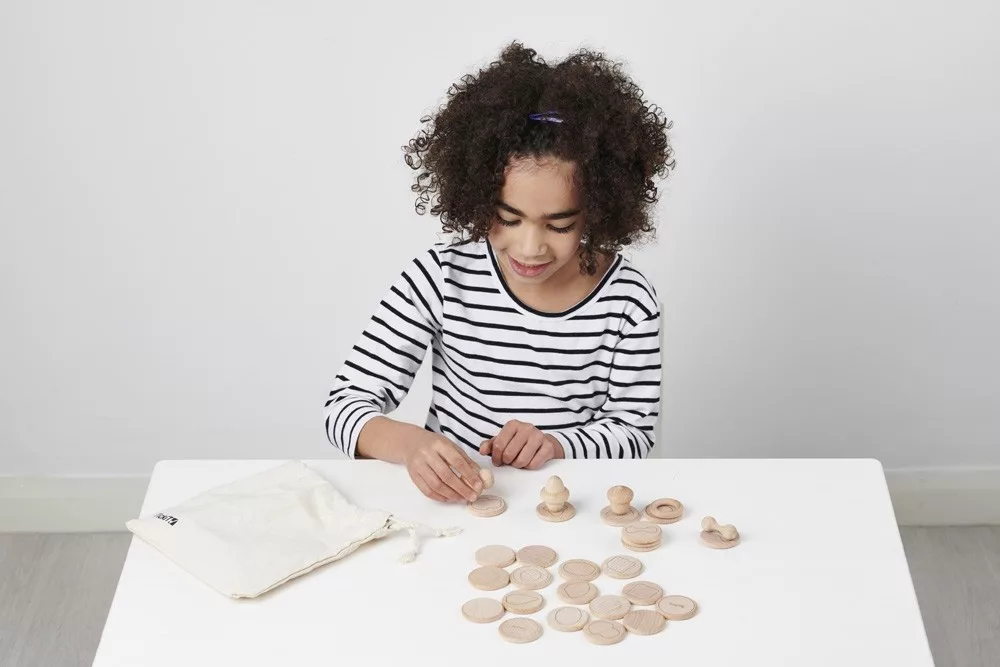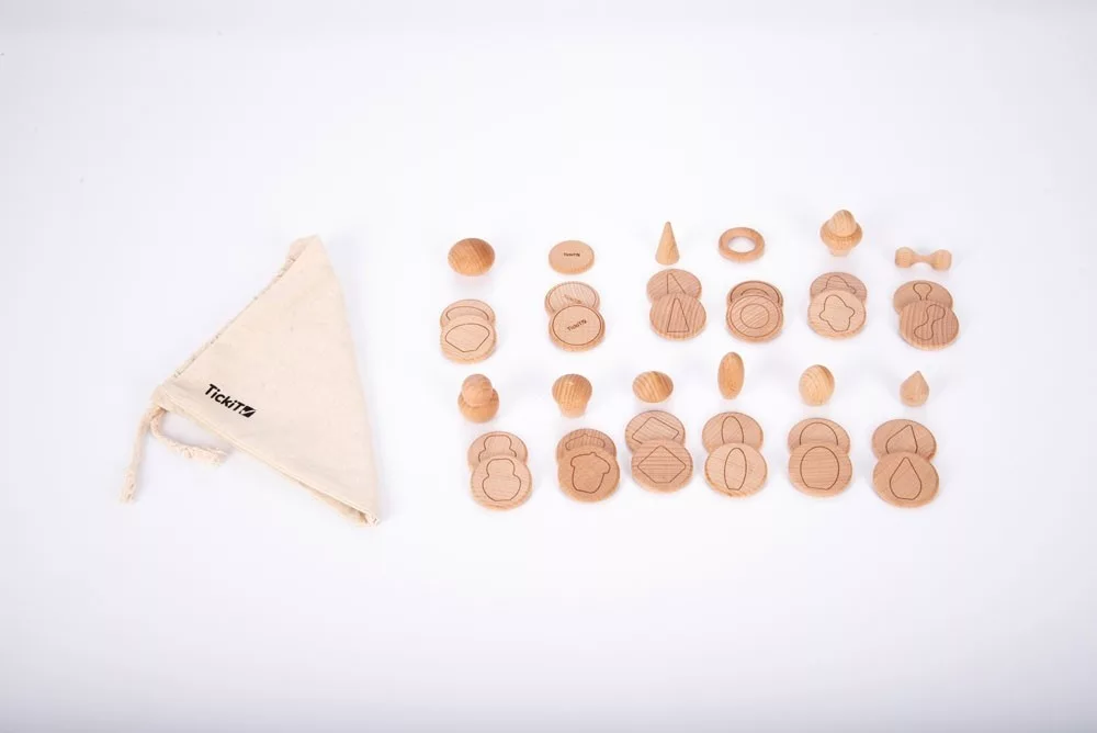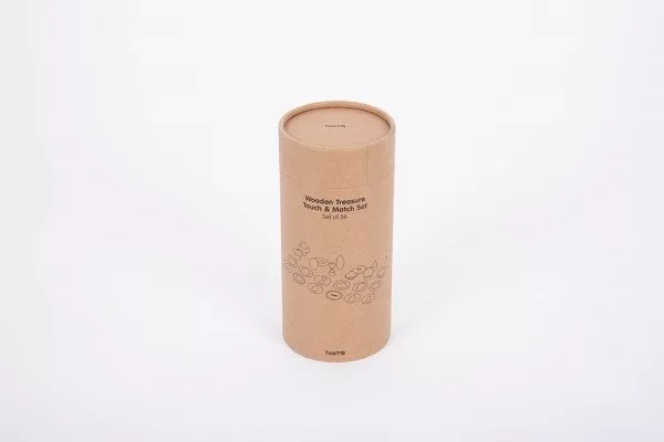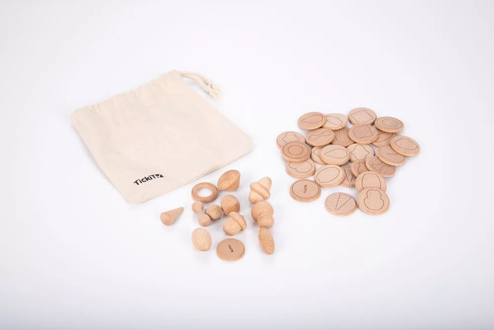 A gyönyörű fából készült szett 12 db natúr színű kis kincset tartalmaz 24 db sima koronggal. A sima korongra a a kis kincsek formáinak körvonala rajzolódik ki. A korongokat kell összepasszintani a kincsekkel. A passzintás történhet tapintás, látás vagy leírás alapján. A játék memóriajátékként is használható. Fejleszti a finommotorikus készségeket, a gyerekek fantáziáját.