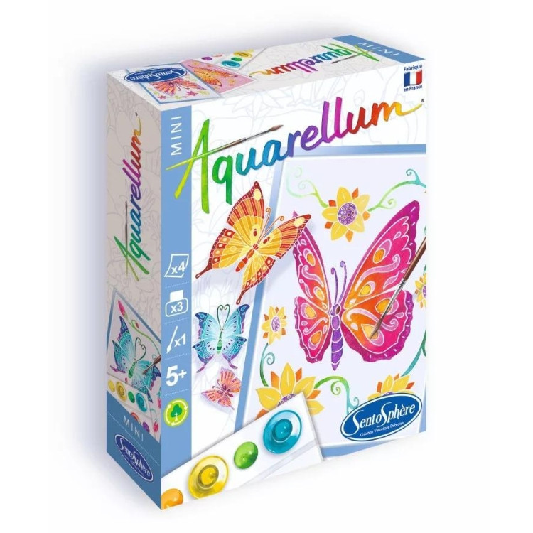 A Sentosphere mini pillangós aquarell készlete tökéletesen alkalmas a színekkel való ismerkedésre. Az Aquarellum Mini a velin papírra festés technikáján alapul: a velin nem szívja be a festéket, mint a porózus felületek.