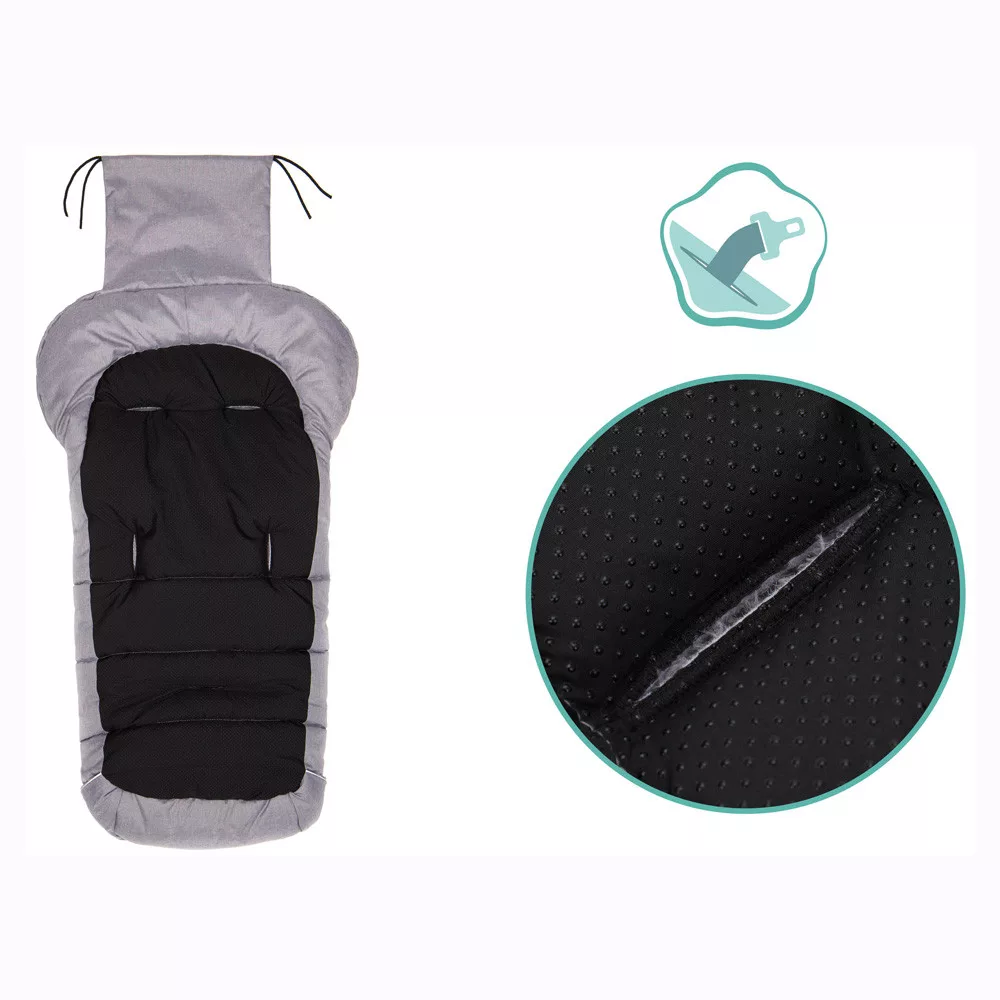 Az 5 övnyílás biztonságosan tartja a K2 lábzsákot a babakocsiban. A csúszásgátló hátlap stabil illeszkedést is biztosít.