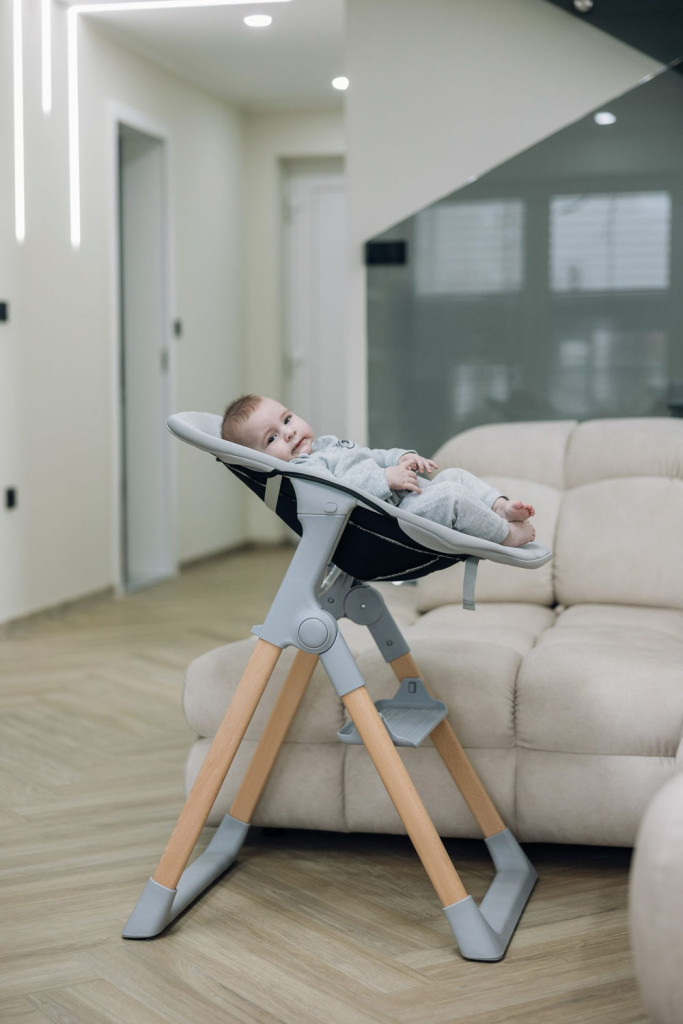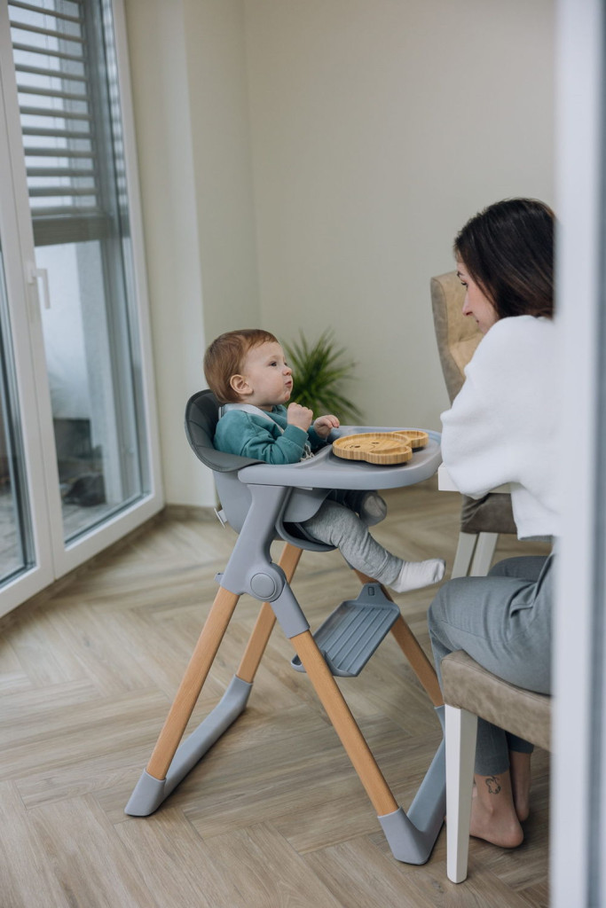 Az etetőszék 3 pontos biztonsági hevederrel és speciális ágyékvédővel van felszerelve gyermeke biztonsága érdekében. A tálca gyorsan és egyszerűen eltávolítható és tárolható a szék hátsó lábain. Ez lehetővé teszi, hogy az etetőszéket a családi asztal mellé helyezze, így gyermeke csatlakozhat a családi étkezésekhez. A lábtartó két pozícióba állítható, hogy megfeleljen gyermeke méretének és kényelmének.