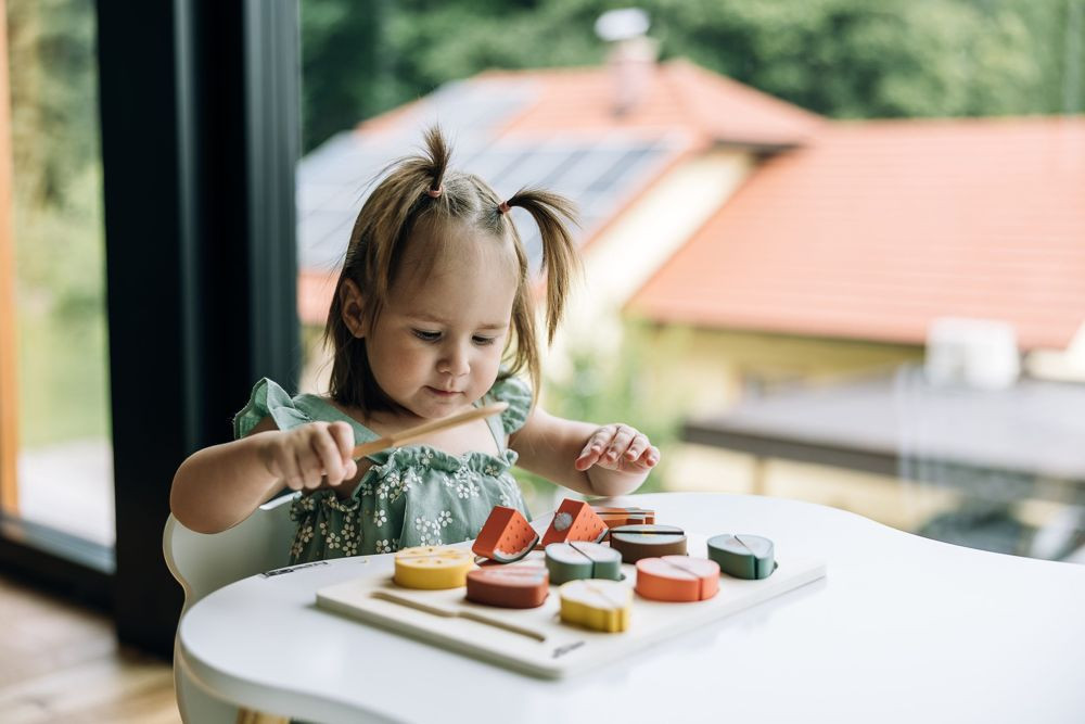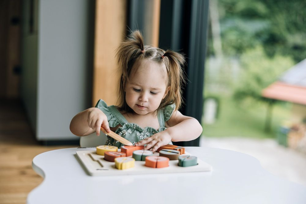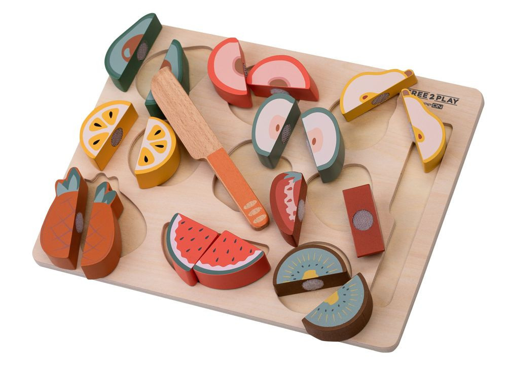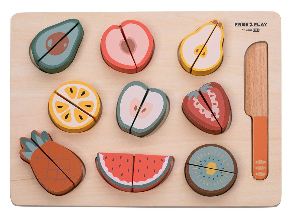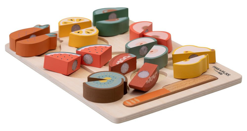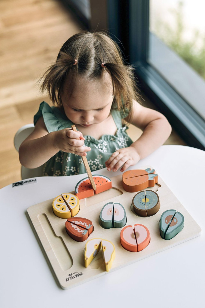 Készítse el gyermeke a saját gyümölcssalátáját. A színes gyümölcs felkelti a gyermek figyelmét és fejleszti a finommotoros készségeket. A gyerekek megismerkedhetnek a különböző gyümölcsfajtákkal, és a fa késsel ketté is vághatják azokat.