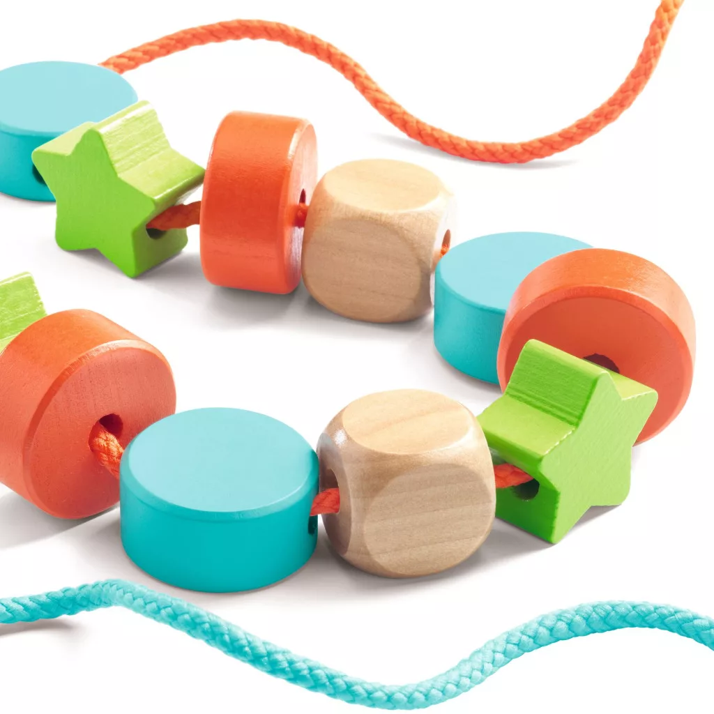 Alapformákat mintázó nagyméretű, fából készült gyöngyökből gyönyörű sorozatokat lehet felfűzni. Ez a szórakoztató tevékenység kézügyességet és koncentrációt igényel. Segíti a szem-kéz koordináció fejlődését. Rendkívül sokoldalúan használható.