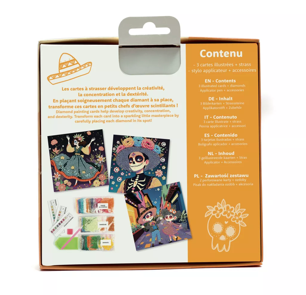 Színes és ünnepi motívumok a Día de los Muertos hangulatában. A csillogó kövek segítségével látványos képeslapok készíthetők.