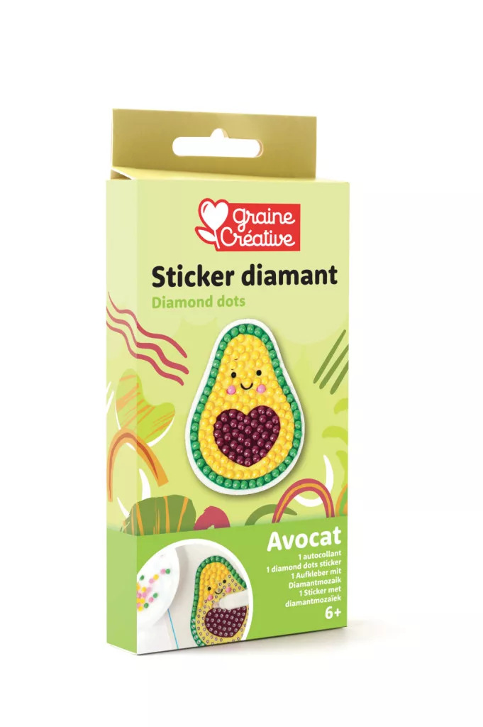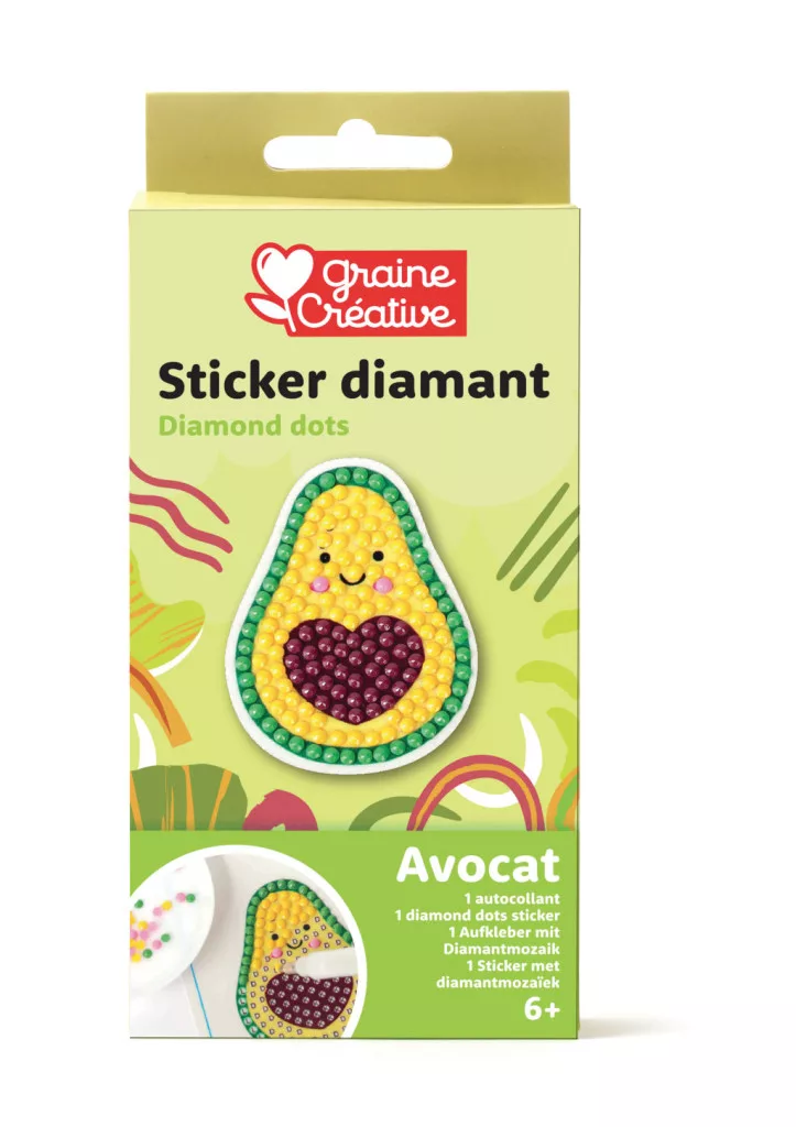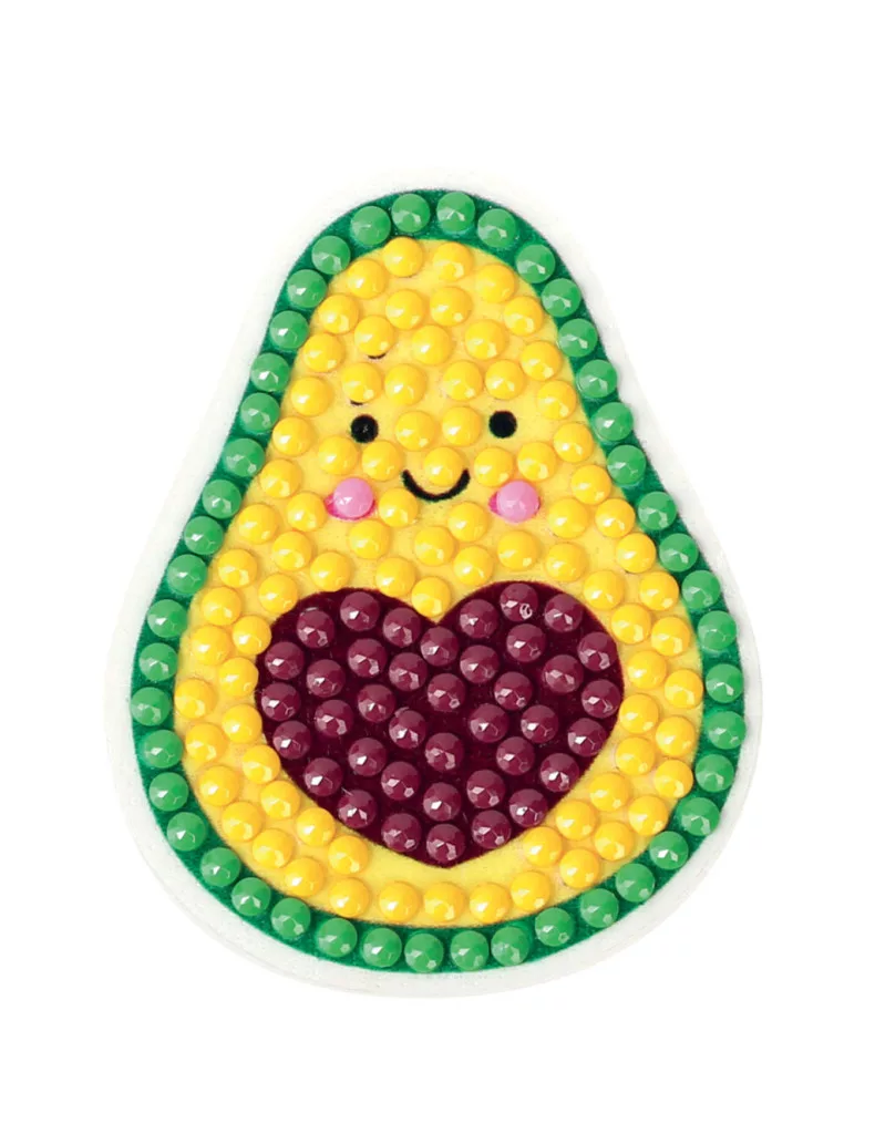 Vidám és csillogó avokádó matrica, amelyet gyémántfestéssel díszíthetsz. Ideális füzetek, dobozok vagy egyéb tárgyak dekorálásához.