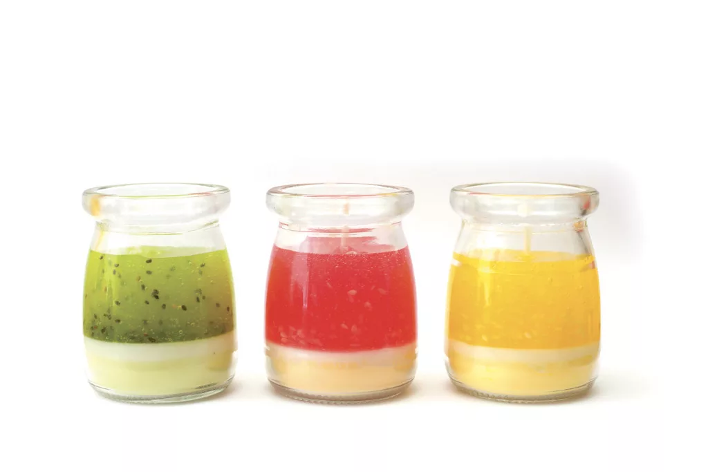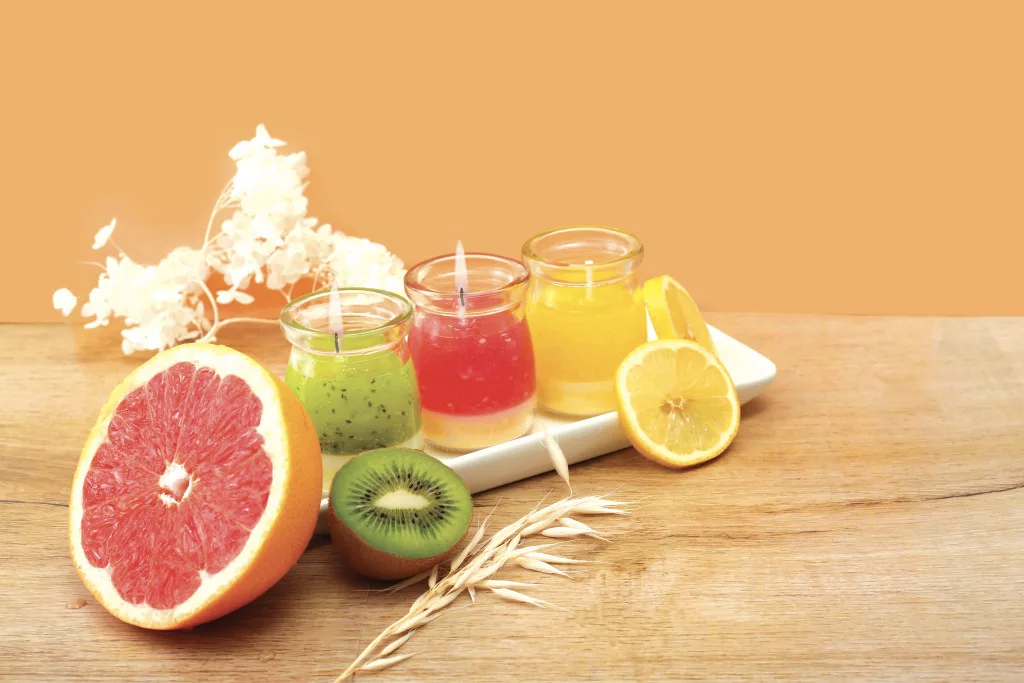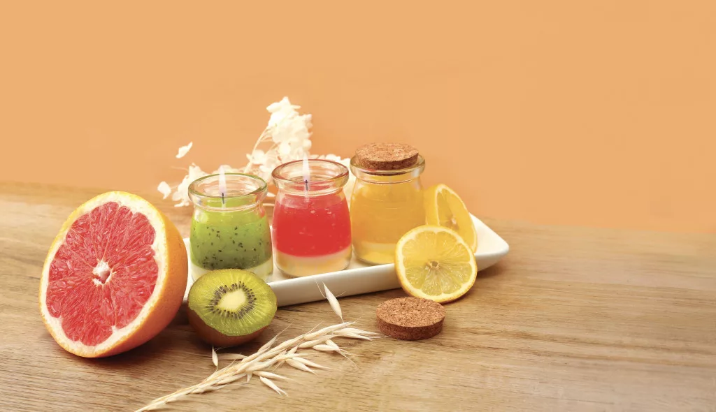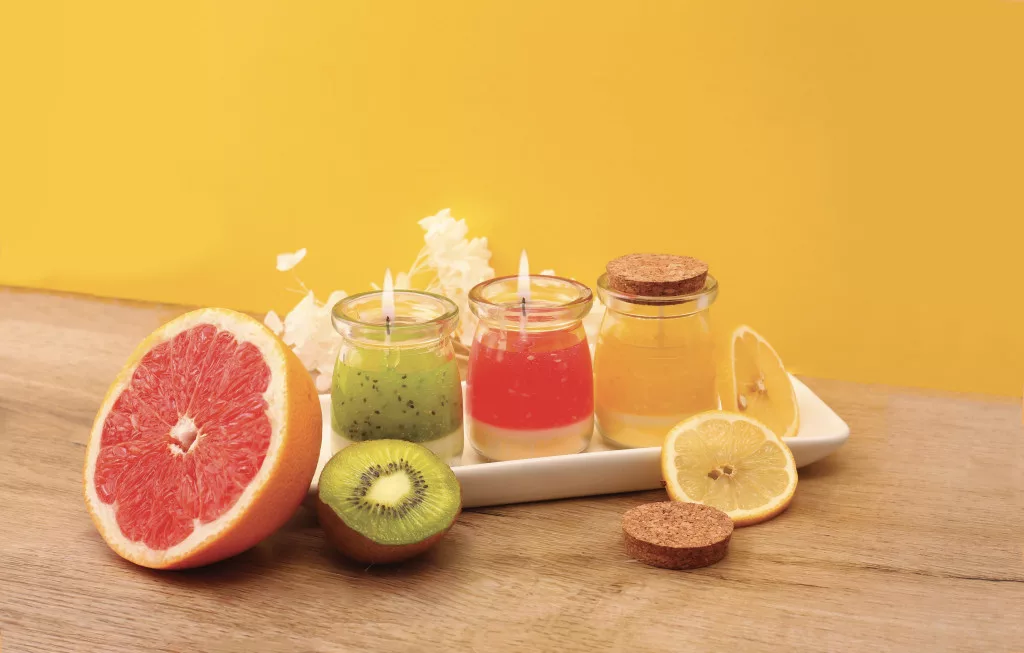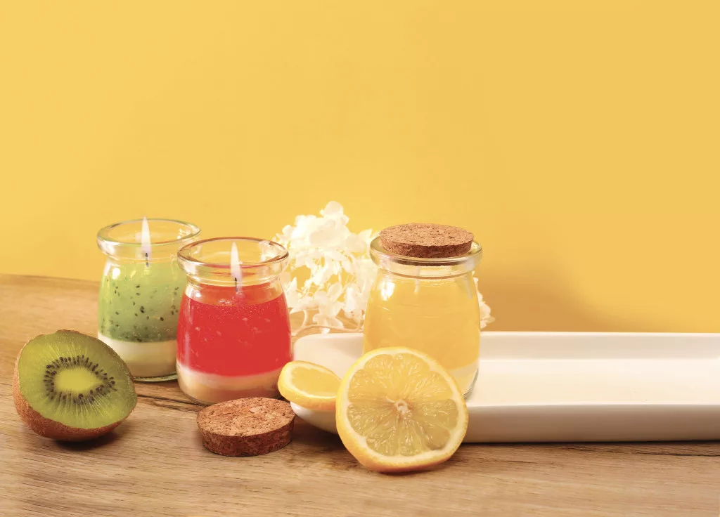 Ezzel a különleges készlettel három gyümölcsös gyertya készíthető: kiwi, grapefruit és citrom. A viasz és a színezékek segítségével látványos, valósághű hatás érhető el. Az átlátszó viasz lehetővé teszi, hogy a gyümölcsös részletek szépen látszódjanak az üvegben. A kész gyertyák dekorációnak is nagyon mutatósak.