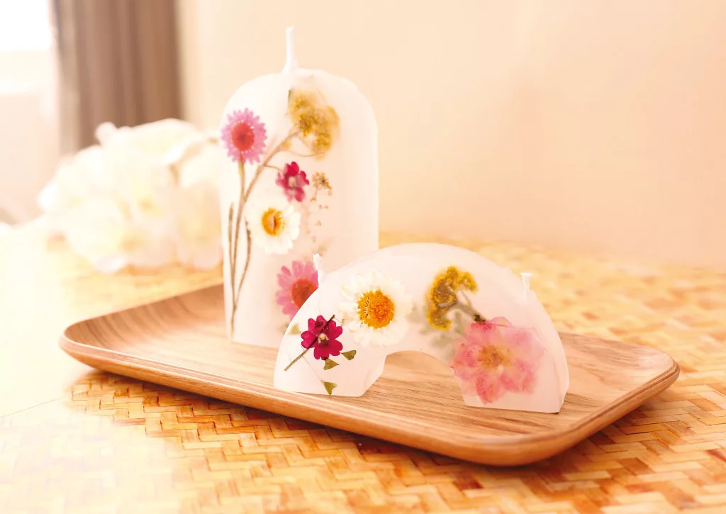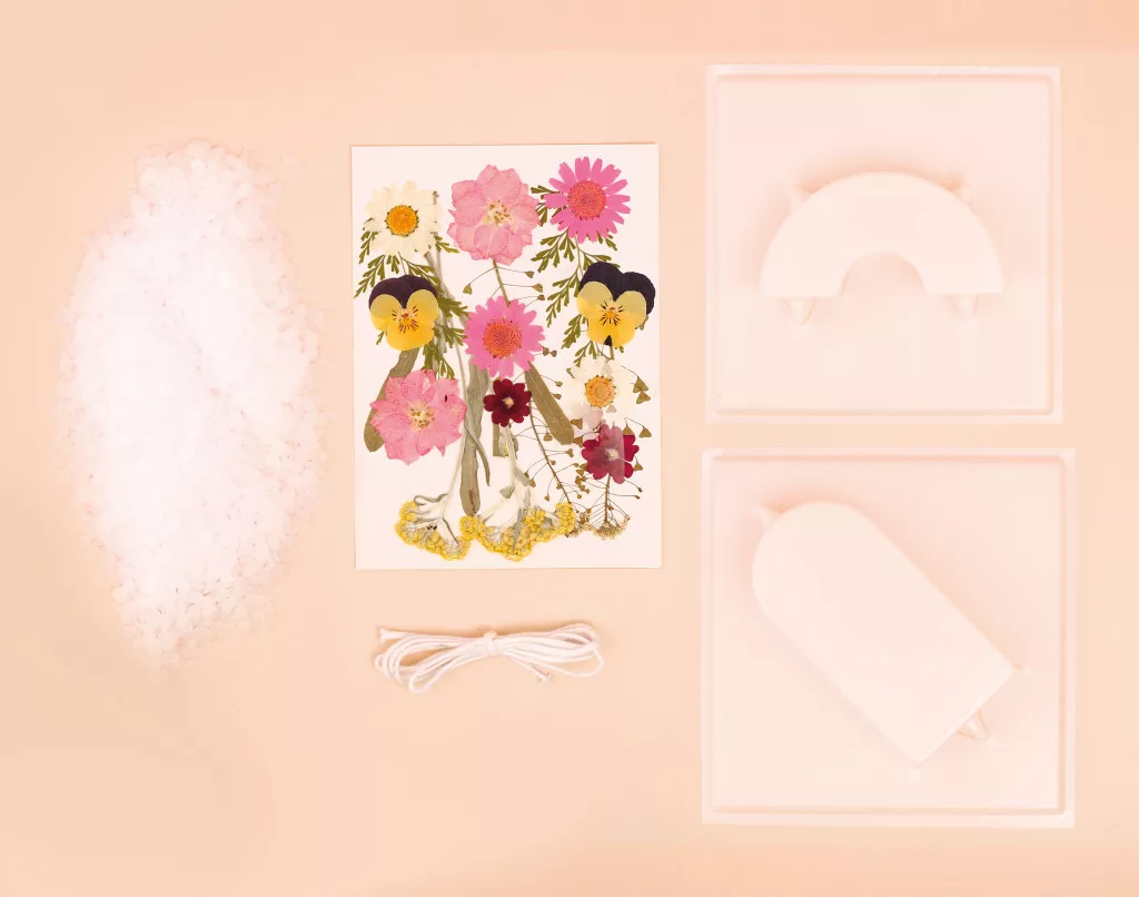 Ezzel a készlettel két dekoratív, geometrikus formájú gyertya készíthető. Az áttetsző paraffin viaszban szárított mezei virágok jelennek meg, ami természetes hangulatot ad az alkotásnak. A gyertyák különösen szépek, ha fény felé tartjuk őket. Az elkészült darabok elegáns lakásdekorációk lehetnek.