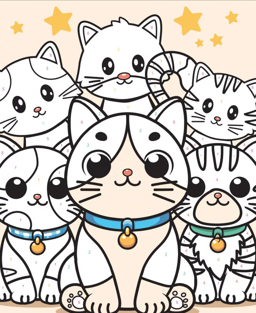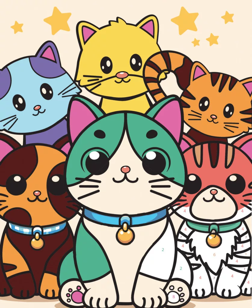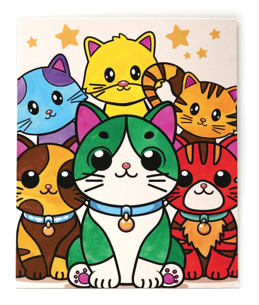 A vidám, mosolygós cicákból álló kompozíció színes és dekoratív képpé válik a festés végére.
