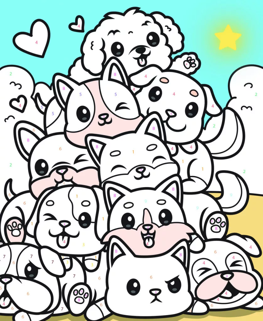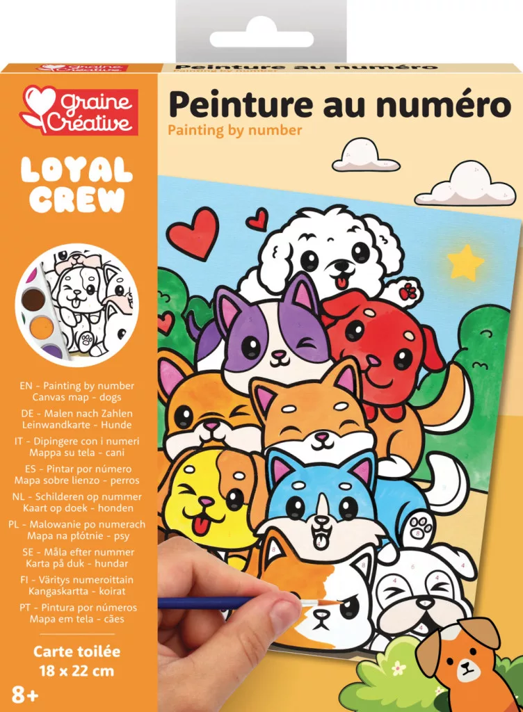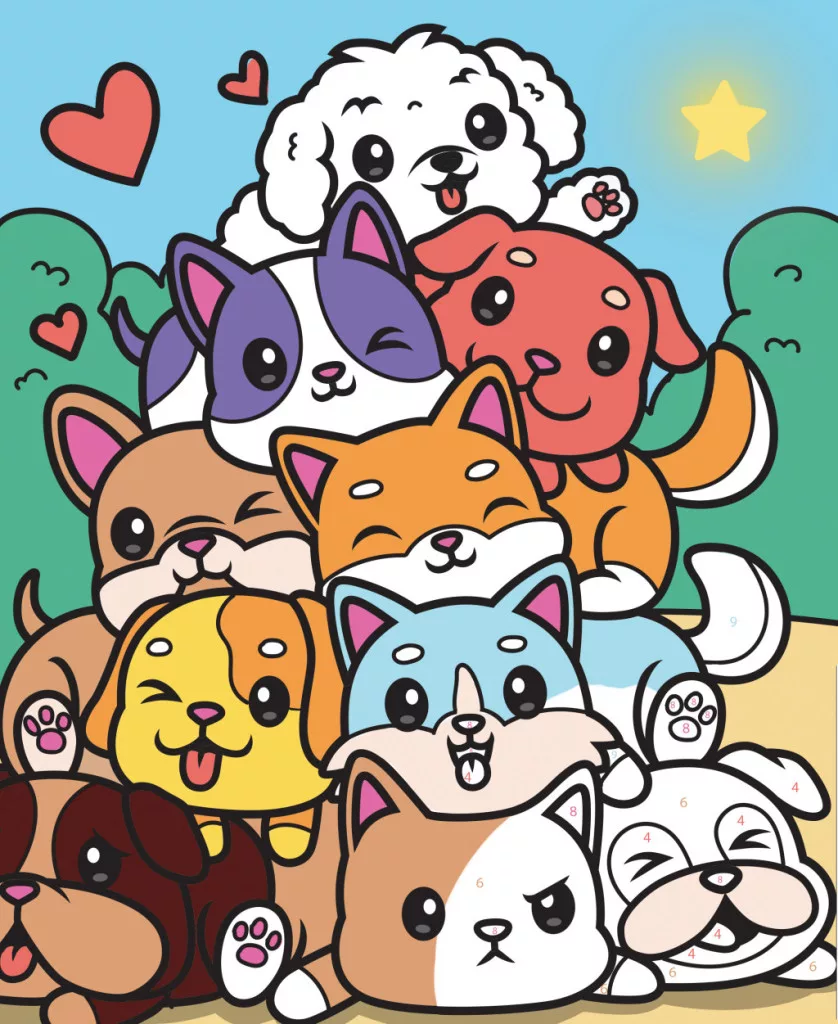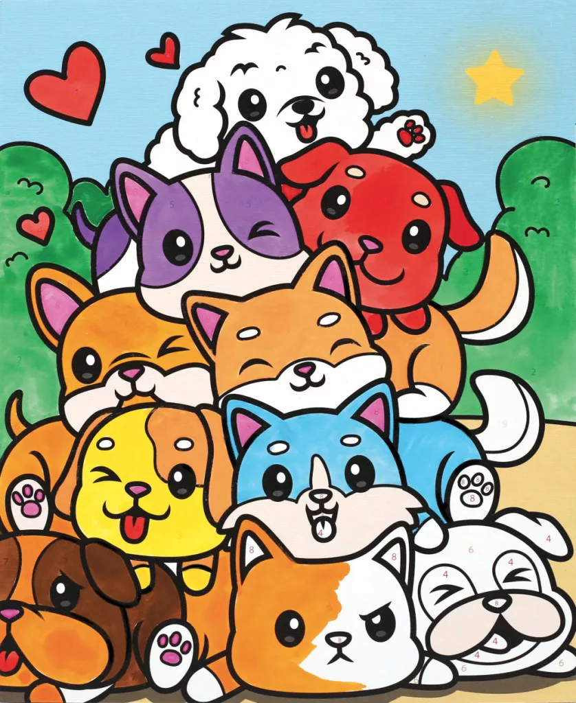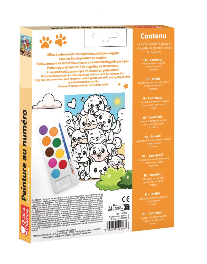 A számfestő készlet segítségével a gyerekek egyszerűen és lépésről lépésre festhetnek meg egy vidám kutyusokból álló képet. A számozott mezők segítik a színek helyes használatát, így a végeredmény garantáltan látványos lesz.