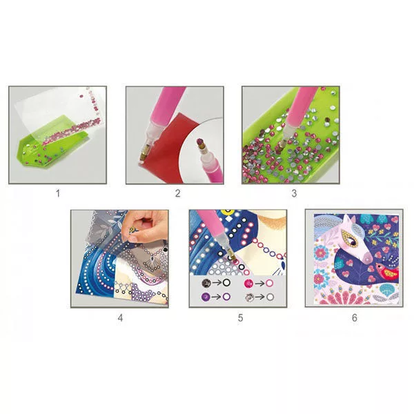 Ha szereted a kreativitást és az alkotás örömét, ez a kreatív készlet biztosan elnyeri a tetszésedet! A gyémántszemes képek új technikával elkészíthető kreatív alkotások, melyek lényege, hogy egy öntapadós felületen kell elhelyezni a megfelelő színű és méretű strasszokat. Az így elkészült kép meseszép dekorációja lehet a gyerekszobának, akár a falra kiakasztva vagy bekeretezve.