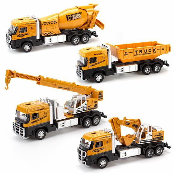 Hátra húzható sárga munkagépek 4 féle kivitelezésben: darus kocsi, betonkeverő, platós teherautó és markológép. Az extra játékélményről a lendkerekek gondoskodnak, melyekkel könnyedén mozgásba lendülnek a munkagépek.