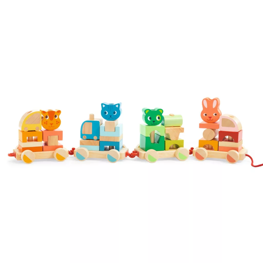 Több darabból álló, minőségi fából készült húzható és építhető játék.