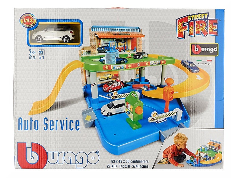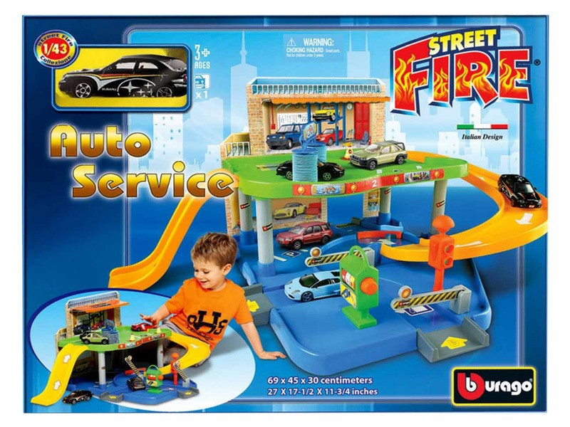 Az 1:43 méretarányú Bburago Street Fire garázs készlet egy emeletes parkolóház, ahol az autókat meg tudod javítani, és fel tudod tölteni benzinnel. Az emeletre rámpákon keresztül lehet feljutni, a Bburago Street Fire garázs készlet csatlakoztatható a Bburago Street Fire autópályákhoz is. A készelt 1 fém kisautót is tartalmaz.