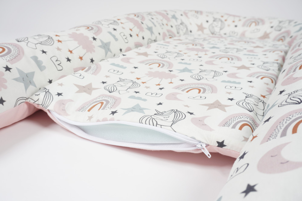 Strapabíró, vastag Oeko-Tex Class 1-es alsó pamutvászonnal és szintén rendkívül bababarát belső mintás, 100% pamut textillel ellátott, amelyek a szivacs kivételével 30 fokon moshatók.