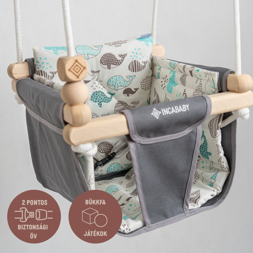 Az Incababy Comfort junior hinta NEM TARTALMAZ bélelt fogvédőt, állítható hintakötélzetet.