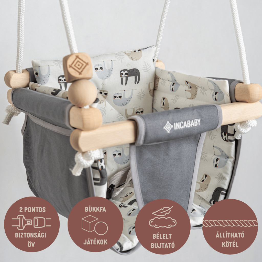 Az Incababy Premium junior hinta TARTALMAZ tépőzáras hintabélést, 2 pontos biztonsági övet, készségfejlesztő bükkfa golyót és kockát, bélelt fogvédőt és állítható hintakötélzetet.