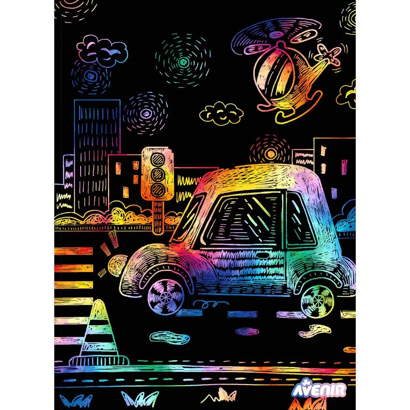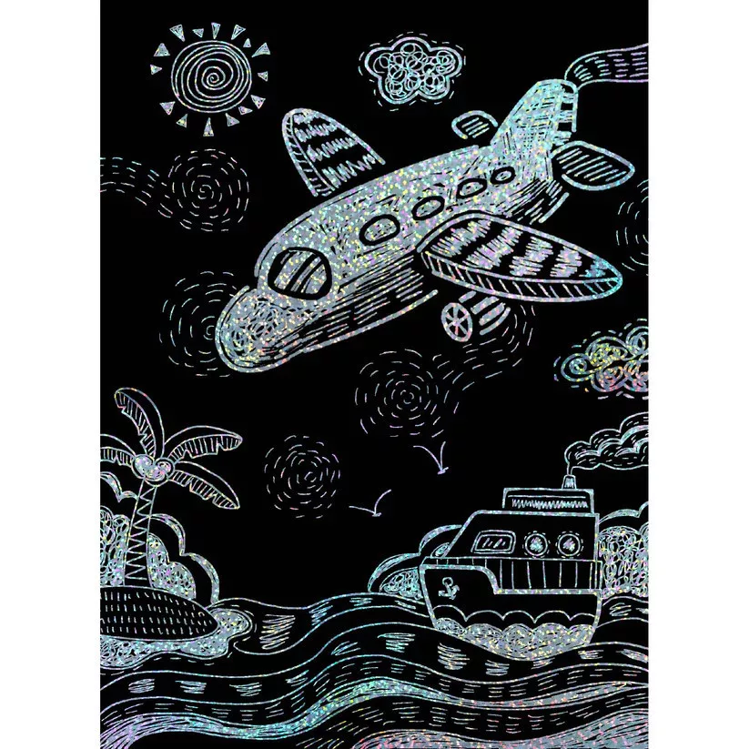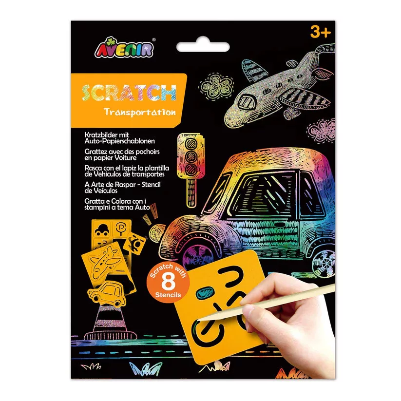 Készíts karcképeket stencilek segítségével! A játékkészletben 8 db stencil, 2 karckép alap (egy csillogós és egy szivárvány színű) valamint 1 karceszköz található.