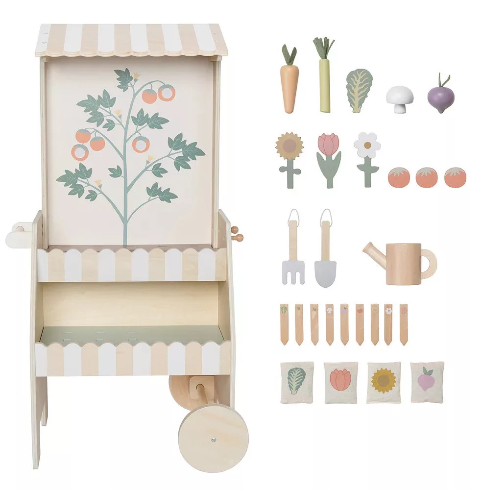 A Jabadabado bájos kertész standjával a kis kertészek felfedezhetik a saját virágaik és zöldségeik ültetésének és betakarításának örömét. Ez a bájos kerti állomás tele van mindennel, amiről egy bimbózó kertész álmodhat - a színes zöldségektől a gyönyörű virágokig, mindez fából készült és készen áll a játékra! A kerti stand lehetővé teszi a gyermekek számára, hogy felfedezzenek, tanuljanak és alkossanak, miközben megtapasztalják a természet varázsát közvetlenül az otthonukban. Ültess fantáziadús zöldségeket, öntözd meg a virágokat, és nézd, ahogy a kis kerted virágzik és kivirul. Tökéletes a kíváncsi kis kezek számára, akik szeretnek termeszteni és kézműveskedni!