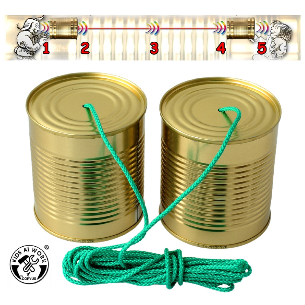Egyszerű telefon. Két konzervdoboz egy zsinórral összekötve.