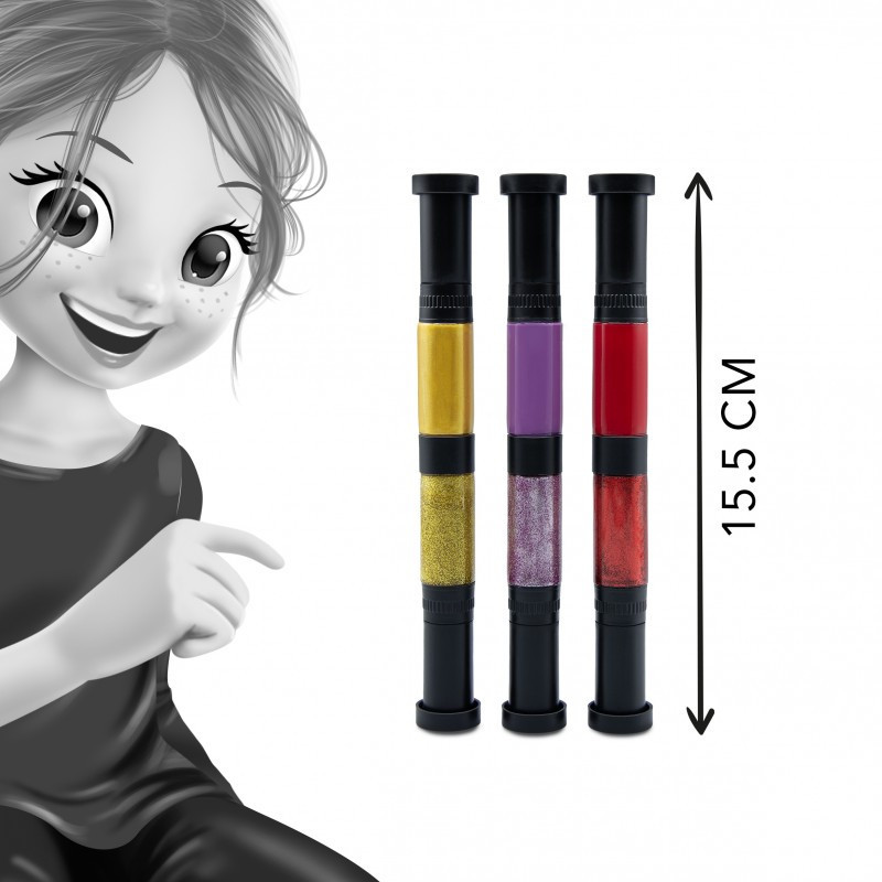 2-az egyben tollak, melyek segítségével igazán divatos körmöket készíthetsz magadnak. Először vidd fel a kiválasztott színt, majd a tollhegy segítségével rajzolj mintákat! A csomagban 3 szín (arany, lila, piros) és csillogós változataik találhatók, így összesen 6 féle körömlakkal dekorálhatod körmeidet. A praktikus tubusos kialakításnak köszönhetően ráadásul mindenhová könnyedén magaddal viheted kedvenc árnyalataidat!