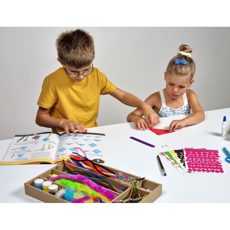Tartalma: több, mint 800 kiegészítő és alapanyag található a csomagban, például hajlítható zsenília rudak, olló, ragasztó, pamutfonalak, fapálcikák, gyöngyök, festékek, matricák, felragasztható mozgó szemek, stb.