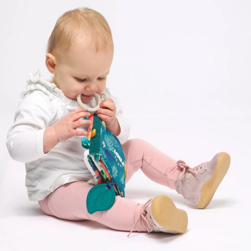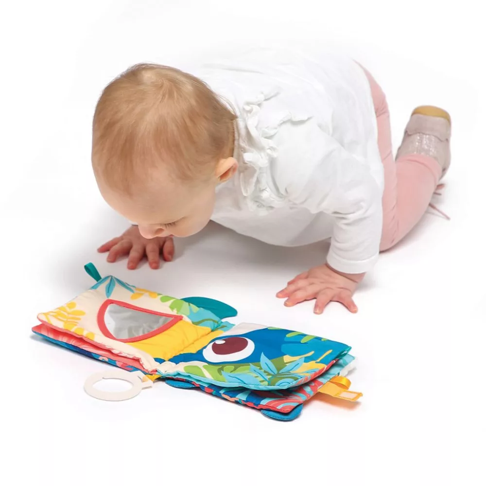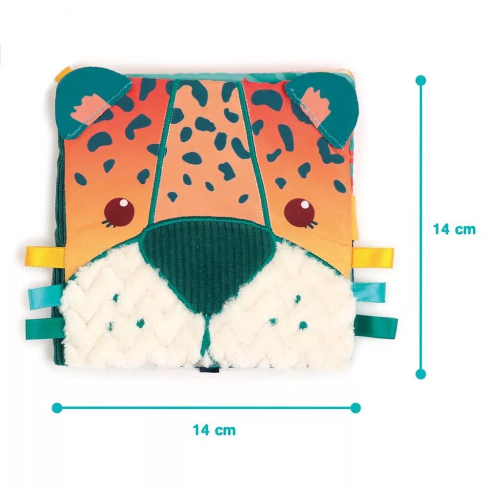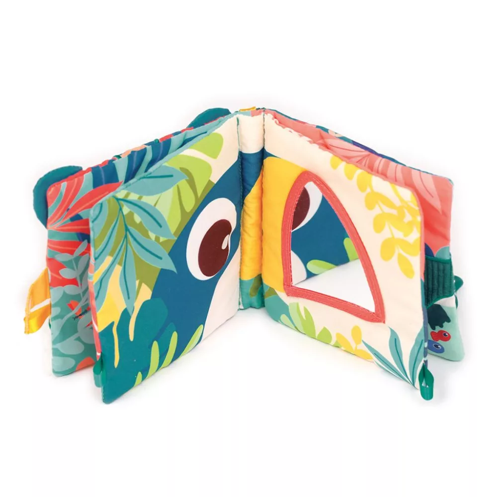 Egy meseszép kivitelezésű dzsungel témájú puha és színpompás babakönyv. A könyv különböző tapintású feleületekkel rendelkezik: a puha jaguár pofi a borítón, tükrös tukán, puha szilikon rágóka, a krokodil bordázott bőre. Ezen felül találhattok még kihajtható füleket és különböző színű szalagfülecskéket is.