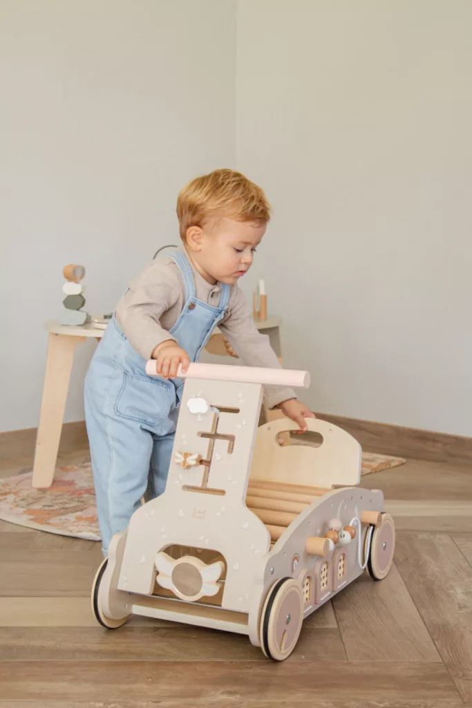 Kezdetben hintalóként fejleszti az egyensúlyérzéket, majd stabil járássegítővé alakul az első lépésekhez. Végül gurulós autóként biztosít önfeledt szórakozást és önálló mozgást.