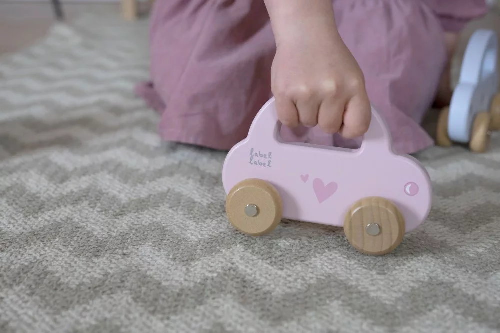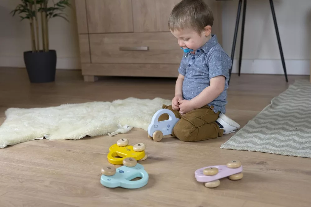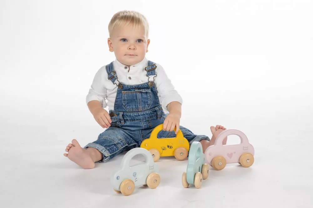 A kisgyermekek könnyedén megfogják az autókat a fogantyúnál, hogy az autókat vezesse, vagy elvigye, ahová csak akarja. Az autók áramvonalas kialakítása, a lágy színek a természetes fa kerekekkel kombinálva tökéletesek a kisgyermek motoros készségeinek serkentésére és fejlesztésére.