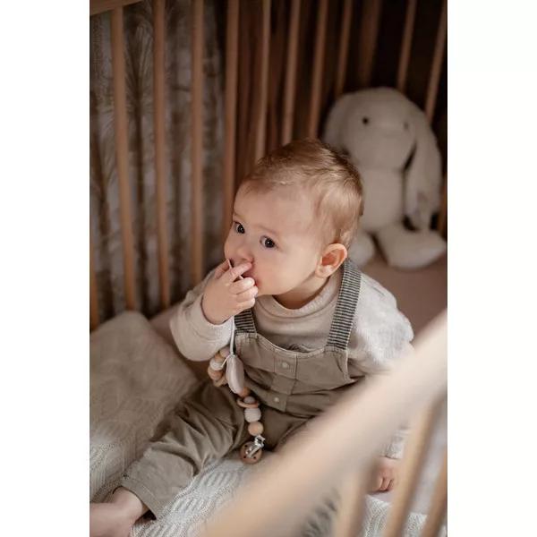 A Label Label stílusos cumilánc a megoldás, hogy a gyermeke el ne veszítse a cumit! És persze ezzel a cumizsinórral megakadályozhatod, hogy a cumi beszennyeződjön, ha esetleg leesik. Ez a szép cumicsipesz gyönyörű fa és rózsaszín színű gyöngyökkel és egy aranyos, virág formájú fogzó játékkal rendelkezik.